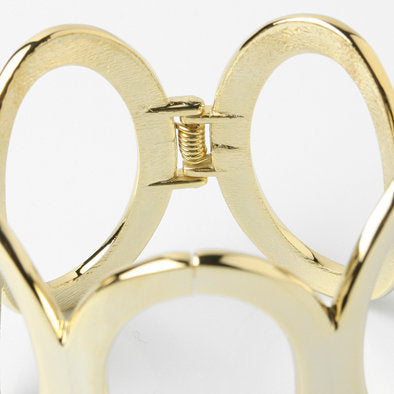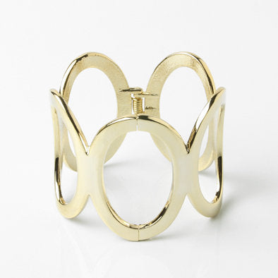 Giant gold tone metal ovals circle your wrist in this funky chunky fashion bracelet. Hinged for wearing convenience.