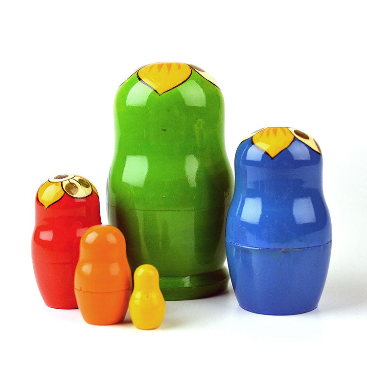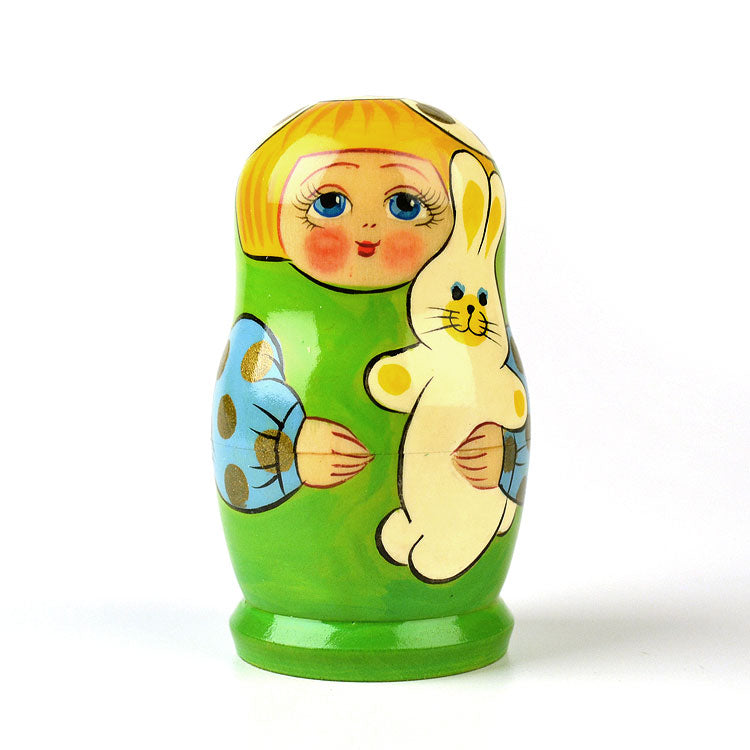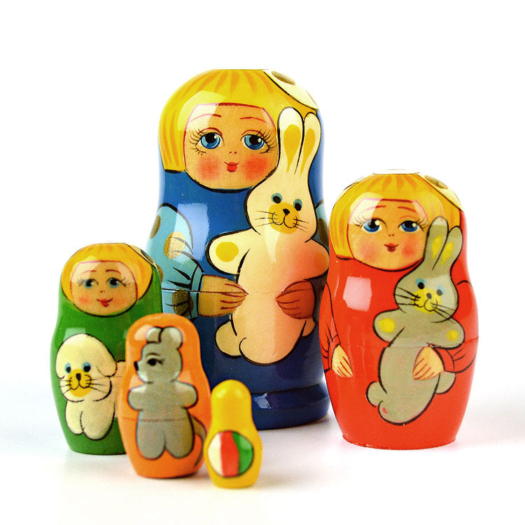 This adorable girl nesting doll with toys was made by a Russian artist who hand crafted the nearly 3 1/2" tall wooden doll. The largest doll features a a girl holding a bunny rabbit. This gloss-finished matryoshka looks good on any shelf or in anyone's hands! Each nesting doll was painted with different colors, thus the colors of your doll may vary slightly from the dolls pictured here.