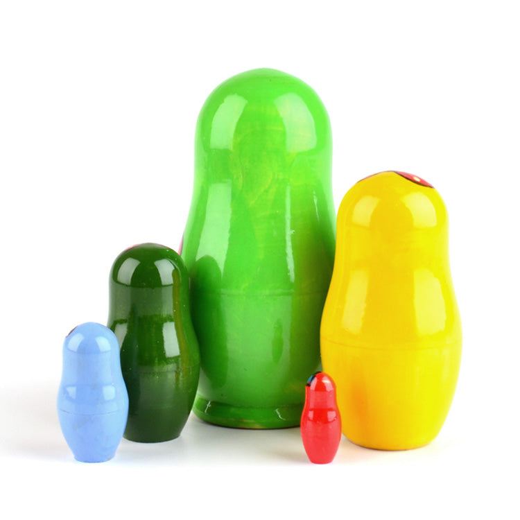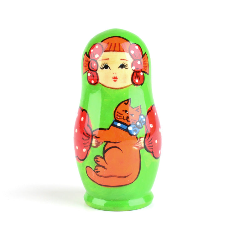 This nesting doll has an artist's simple rendition of a young girl with her cat. It features basic colors and is about 3 1/2" tall. Cheer up any room with this 5 piece, highly glossed nesting doll from Russia.