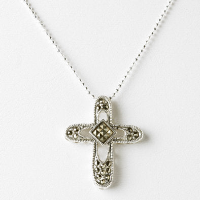 This rounded cross pendant features Marcasite crystals set in beaded Sterling Silver with a grid of Marcasite ornamenting the center. Strung on a diamond cut bead style chain for extra sparkle.