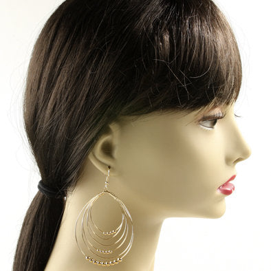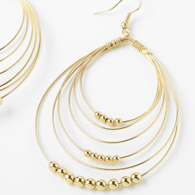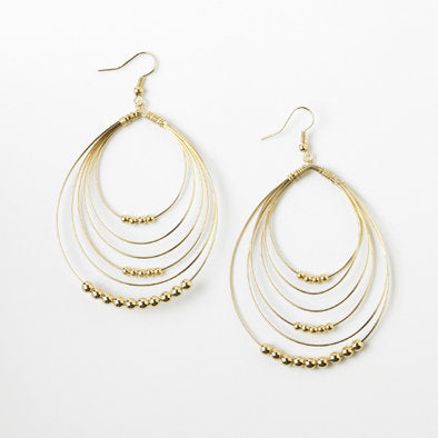 six gold tone hoops of graduating size, three of which are strung with small beads, curve into a teardrop shaped earring dangling from a hoop adorned with another small bead.