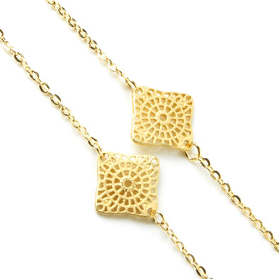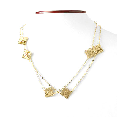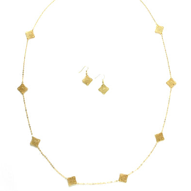 This gold tone fashion jewelry set has a matching necklace and earrings. The necklace has matte metallic squares with decorative lace pattern cutouts on a gold tone chain. Each earring has a matching square dangling from a hook ornamented with one small bead.