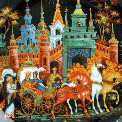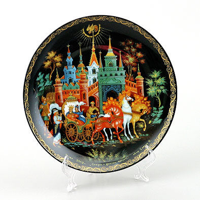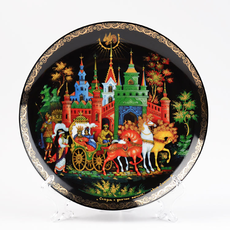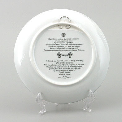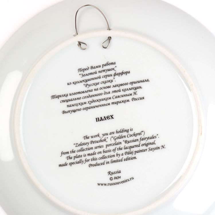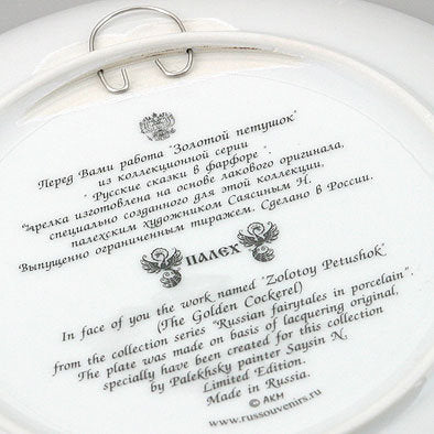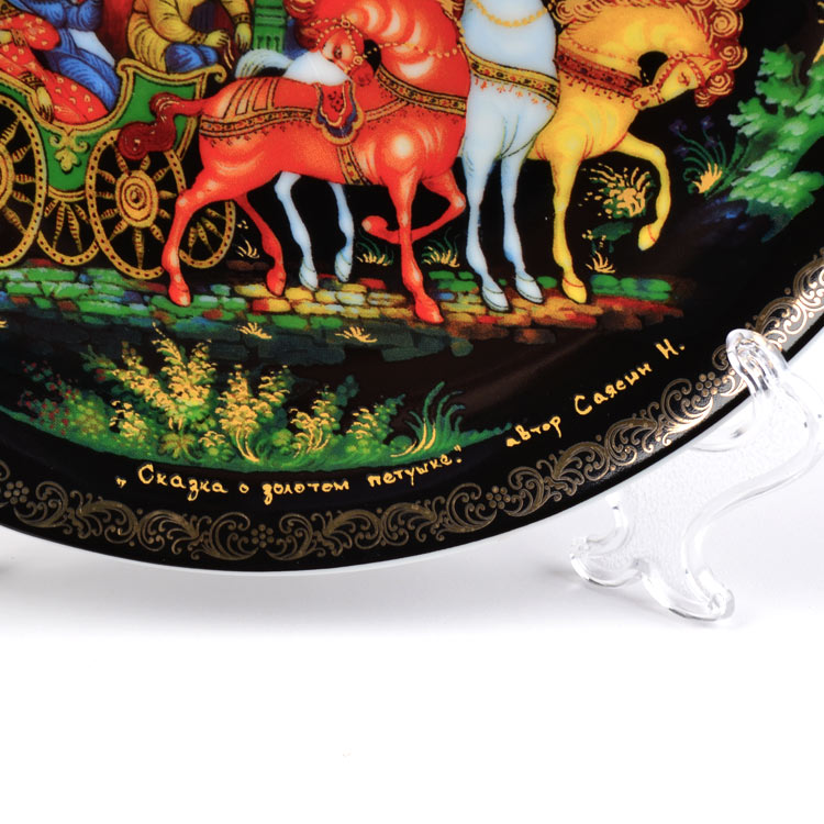 The work you are holding is "Zolotoy Petushok" ("Golden Cockerel") from the collection series "Russian Fairytales". The plate was made on basis of lacquering original, specially have been created for this collection by Palech painter Saysin N. Produced in limited addition. This plate includes a stand and a wall hanger for display, and comes in a Russian box. The plate is made of high quality porcelain and the picture is made in technique of a decal so the price for this decorative plate is quite affordable.