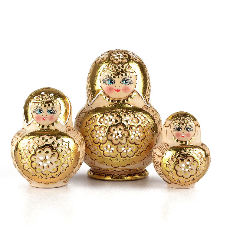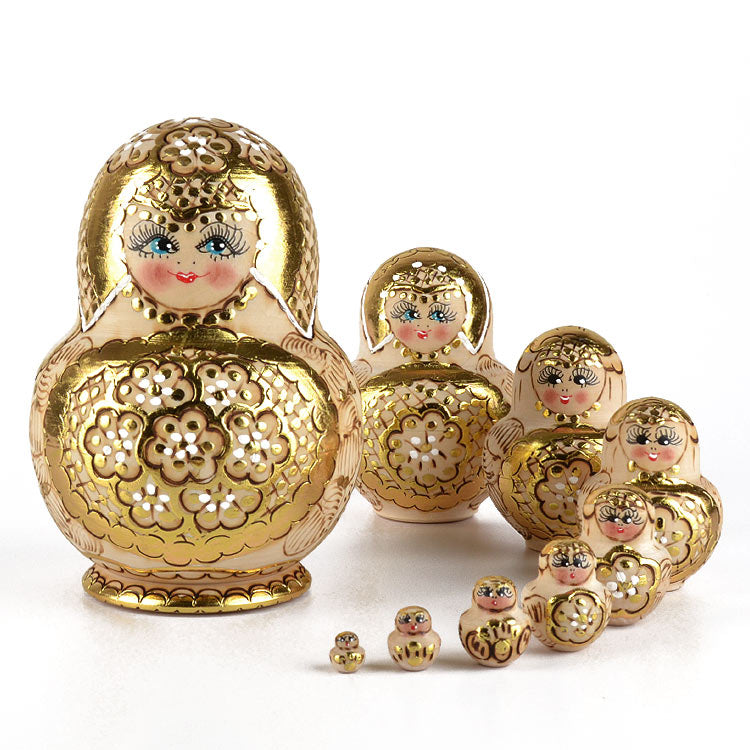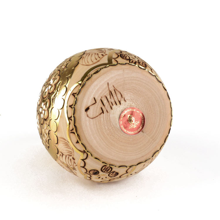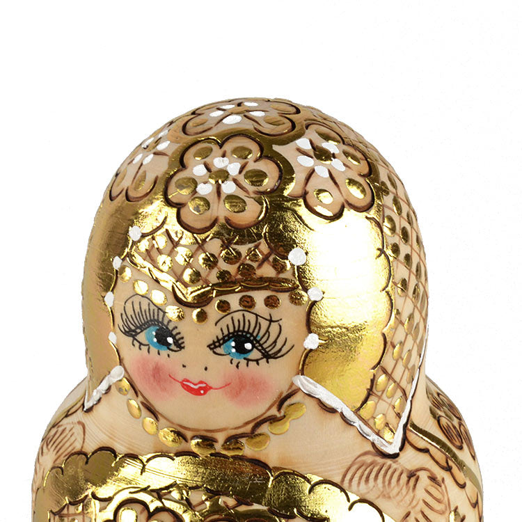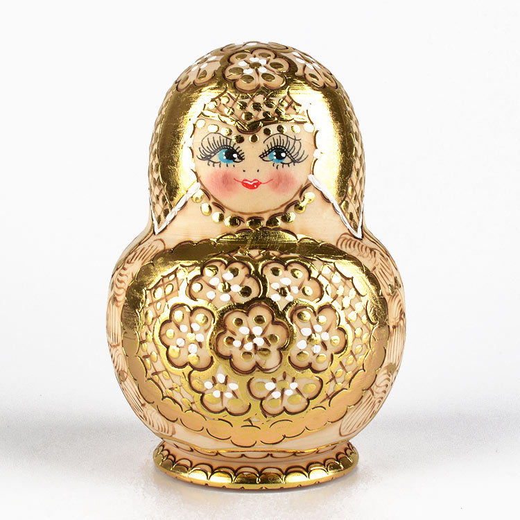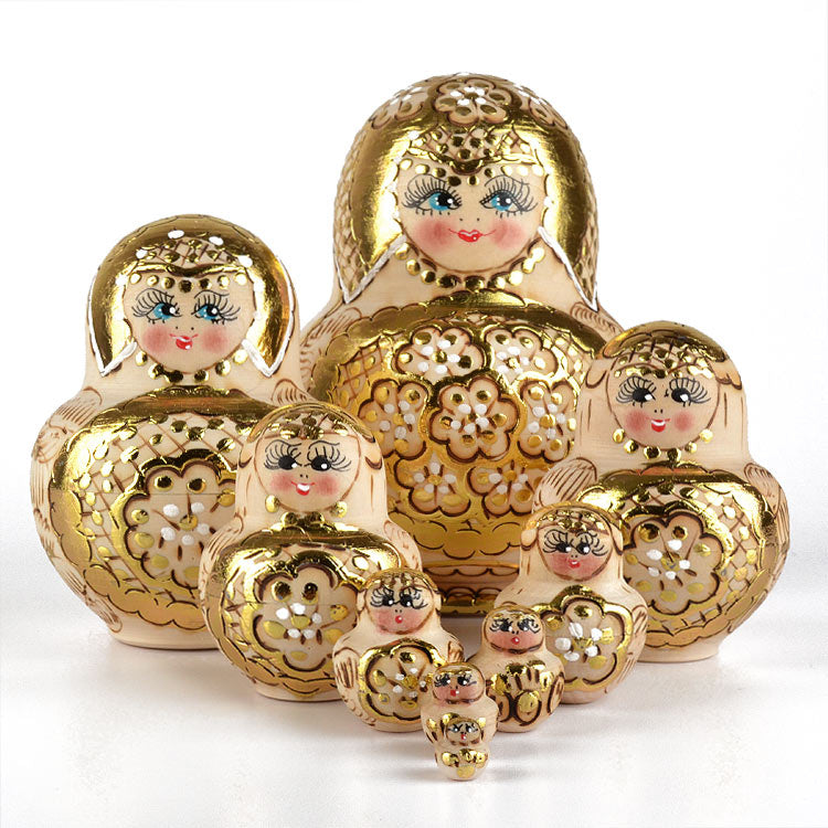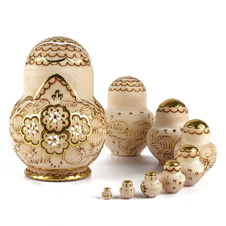 This simply stunning "short and chubby" variety of nesting doll features a wood-burnt floral design with shiny gold (and a little bit of white) accents. This 10 piece wooden doll is sure to bring joy to any home or anyone! She stands nearly 6" tall. Made in Russia and ready to ship in the USA from The Russian Store!