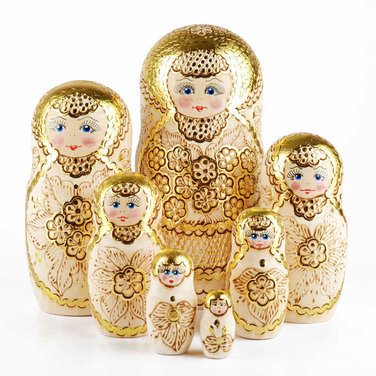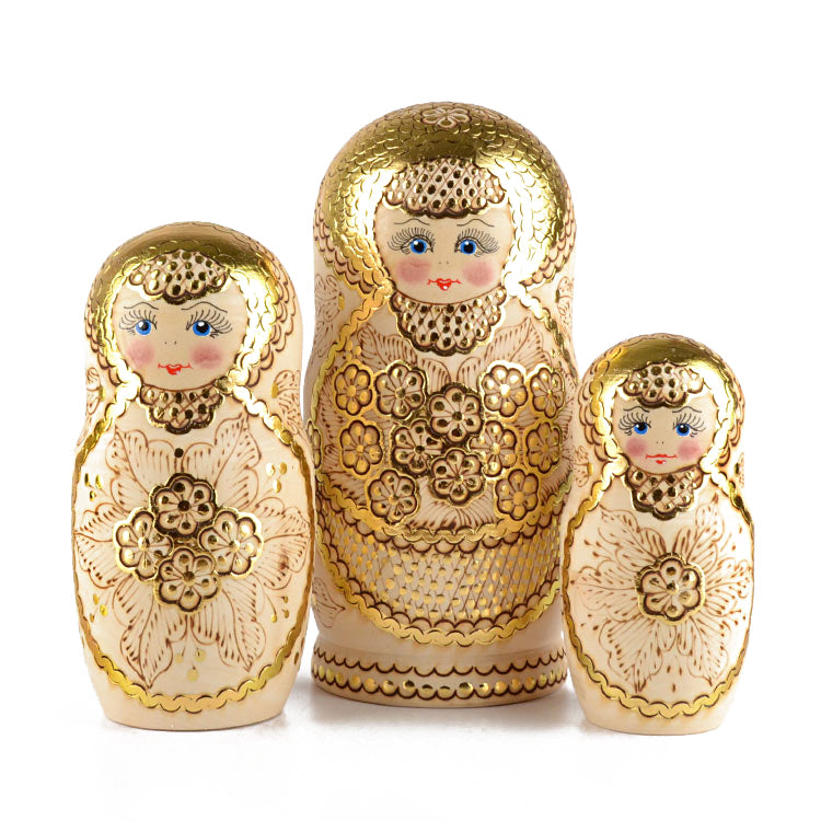 Glowing with lots of shimmering gold, this floral design wood-burned nesting doll is just simply stunning and a favorite of many. The poker-work by the artist is wonderfully integrated with the gold-leaf application. The matryoshka stands about 9" tall and has a total of 7 similar dolls. Crafted by hand in Russia.