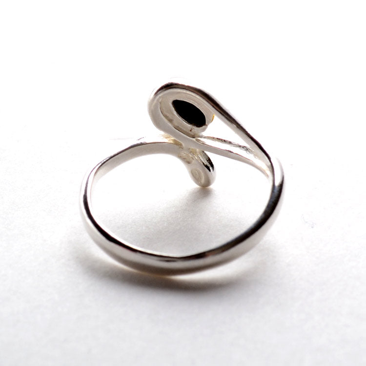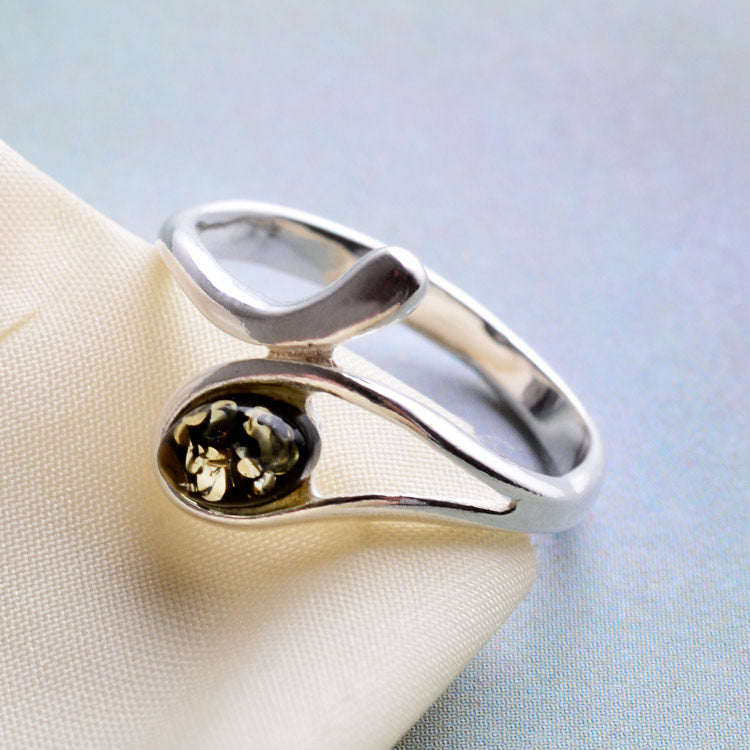 This simple yet sweet green amber ring is unique and modern yet timelessly classic. The pairing of sterling silver and amber has been a industry staple for jewelry makers for generations and generations now, and the tradition is still going strong. This ring is one example of fine affordable amber and silver jewelry with a modern twist. And when we say twist, we mean it with this piece. The sterling silver setting has been twisted and bent around the green amber bead to create a fashionable look that is eye catching but not overpowering. The setting allows light to shine through the back of the stone which really makes it sparkle in the sunlight. Pick up your own amber and silver ring today!