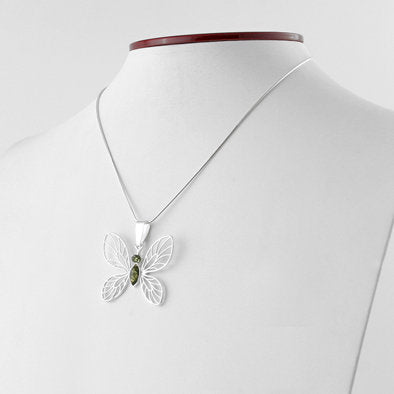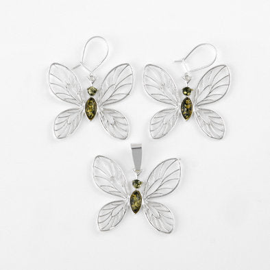 Green Amber stones with unique natural inclusions form the head and body of these striking matching butterfly earrings and pendant. Marquise-shaped Amber forms the body and a round Amber stone forms the head, set together in elegant .925 Sterling Silver wings. The earrings dangle from an simple latched hook, and the pendant hangs from a large Silver bail.