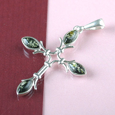 This green amber cross pendant has a high concentration of inclusions and would makes a beautiful charm for any chain. The pendant is hand made and set in a classical sterling silver case.