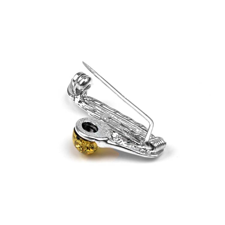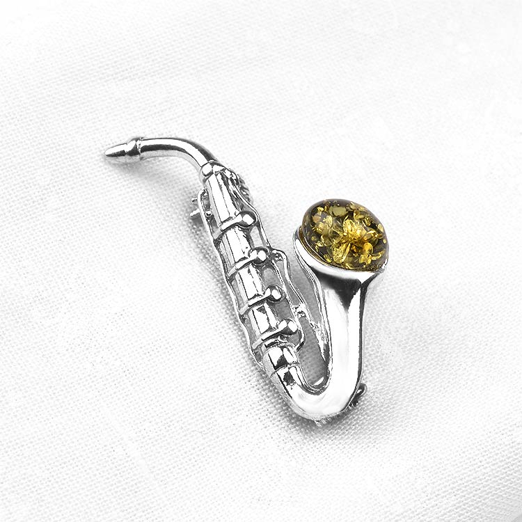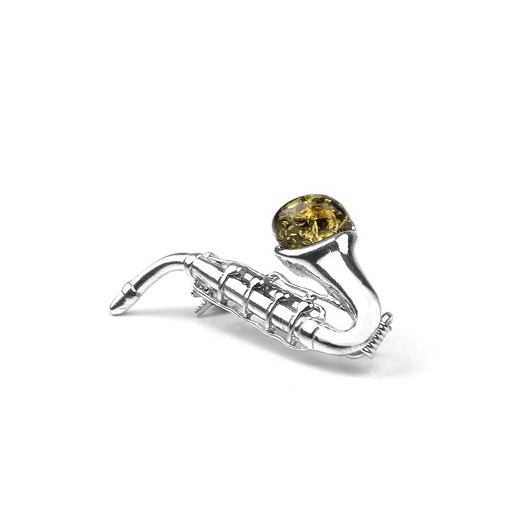 This awesome little pin features a glittering green amber stone and a sterling silver saxophone musical instrument design. It is about 1 1/4" long and just over 1/2" wide. The rare green amber is about 1/4" in size.