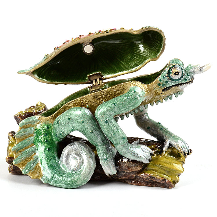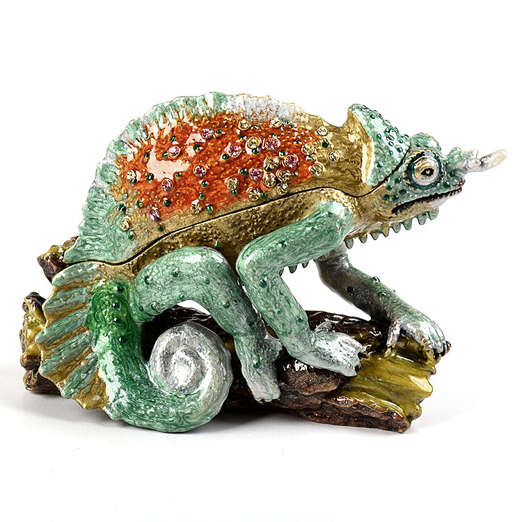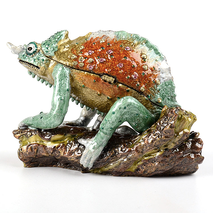 This Chameleon sitting on a branch trinket box is hand painted and glazed with pearlized enamel. It is accented with hand-set sparkly Austrian crystals. Decorative and useful, this holds miniature keepsakes such as rings, earrings and small jewelry.