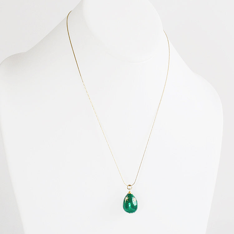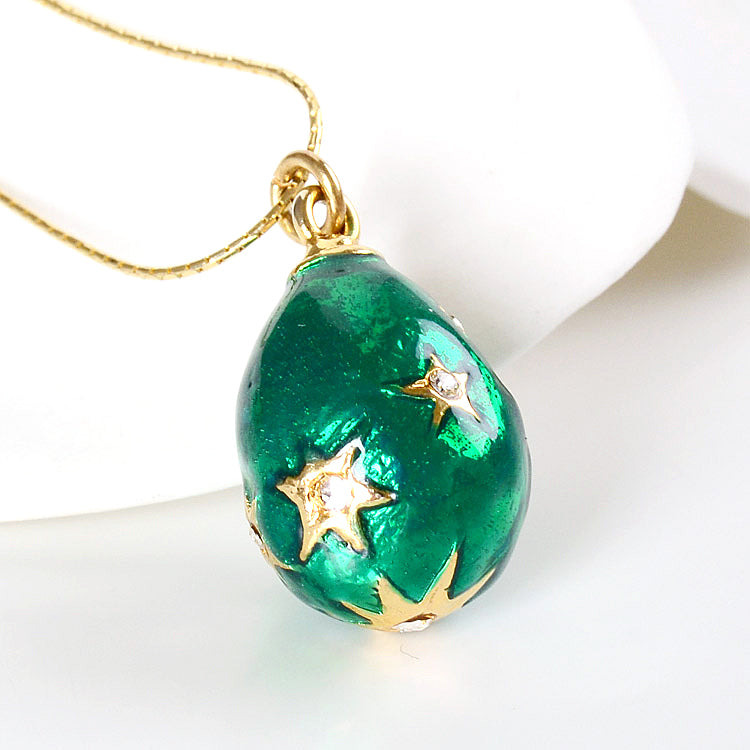 This green Faberge style egg pendant-charm is adorned by shimmering enamel and Austrian crystals. hand-crafted and hand-enameled with star shapes, the egg is a symbol of life, rebirth to the new life, and love.