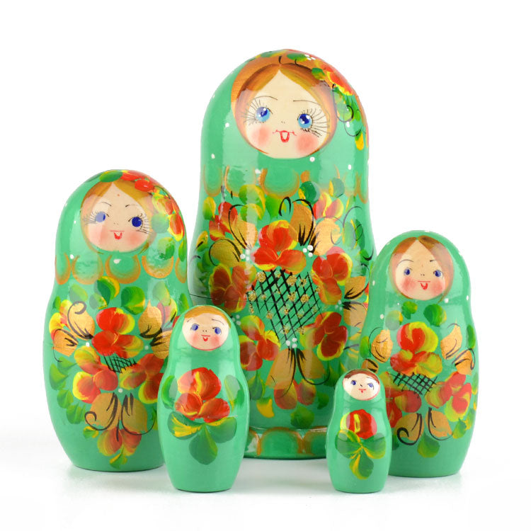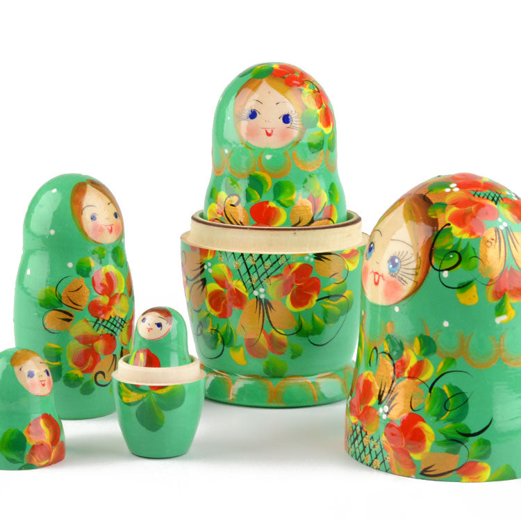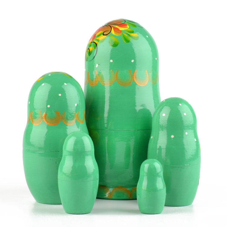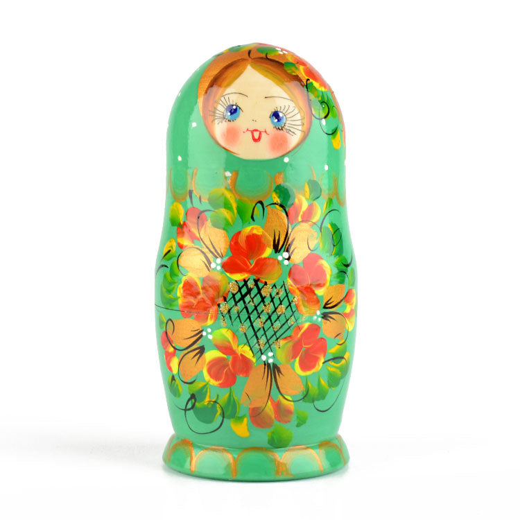 This unique green colored nesting doll is about 6" tall and was hand-crafted in Russia. She features a floral design with golden accents, and she is gloss finished. Makes a fun gift!