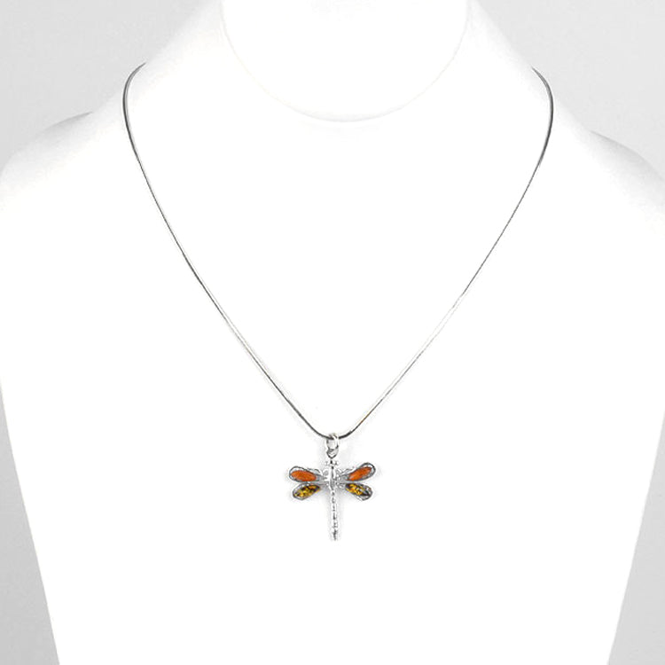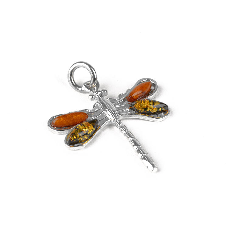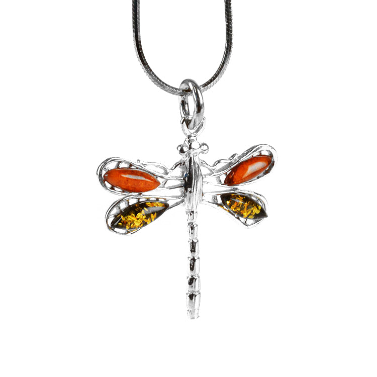This dragonfly insect pendant was made in Russia with genuine amber and sterling silver. The pendant is 1 1/4" long and 1" wide. The polished amber stones are about 1/4" long. This is a lovely piece of detailed jewelry and makes a wonderful gift for anyone!