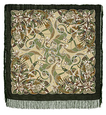 This Russian Shawl is perfect for display in your house or apartment as a piece of home decor. It features a predominately green color scheme with flowers accented by flowing and swirling light and dark green patterns making an incredible unique, and interesting display.
