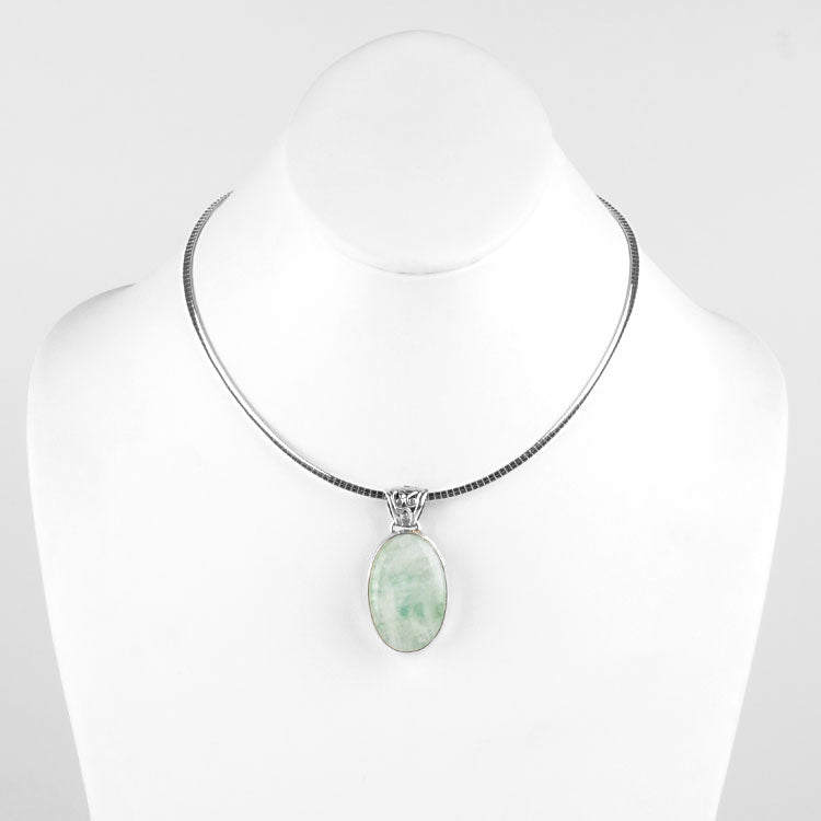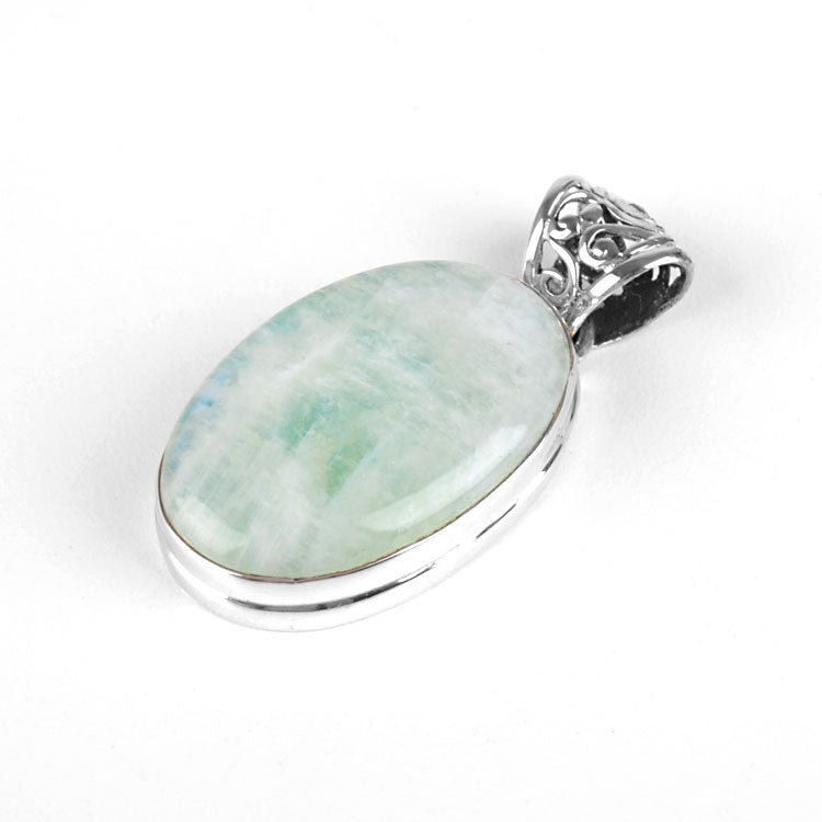 Marvel in the magic of moonstone with this stunning green moonstone in sterling silver pendant. The 1 1/4" x 3/4" natural polished gemstone has a white/green color to it, until light hits it, then it glows with electric blue! Truly a great hand-made piece of jewelry. Accented with a stylized bail of silver filigree.