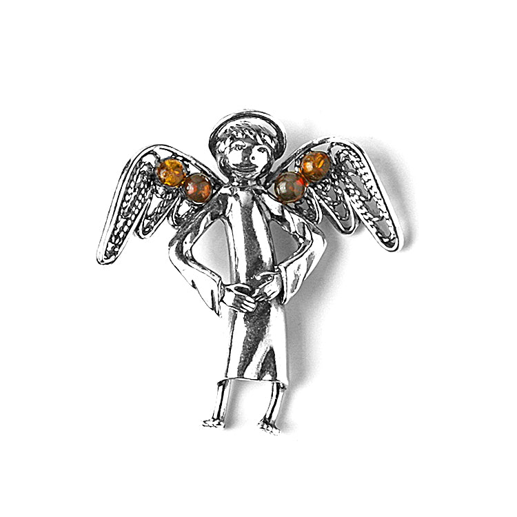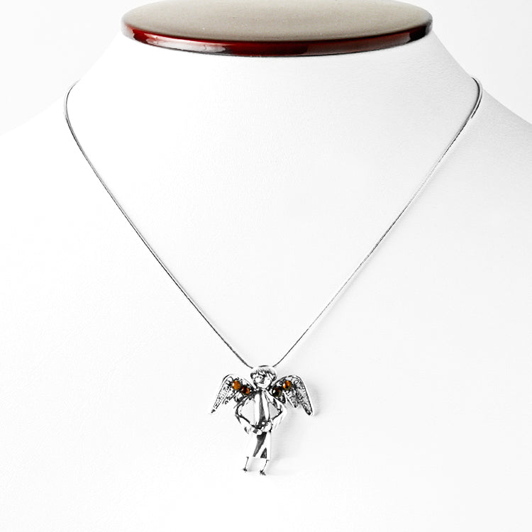 This adorable pendant features an intricately designed, and beautifully crafted guardian angel with an adorable smile on its face. The angel measures 1 1/4" tall, and has a wingspan of 1 1/8". Upon its wings, complimenting an elegant pattern of sterling silver, are honey amber beads with a diameter of 1/8". This pendant would make a great gift for any occasion!