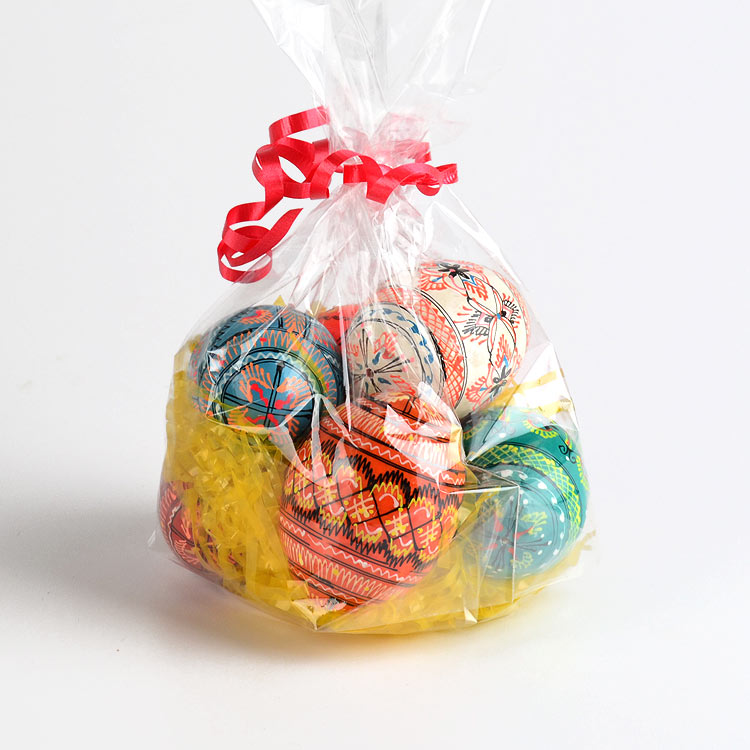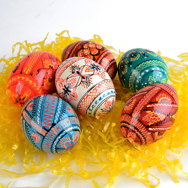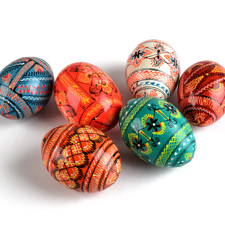 Each one of these colorful eggs is Approximately 2" to 2 1/2" long and features a hand-painted pattern of lines, dots, dashes, and abstract designs. Brighten your Easter this year with lovely Russian Pisanki Eggs! (aka Pisanka, Pisanky, Pysanky). Made of wood. Set of 6 eggs.