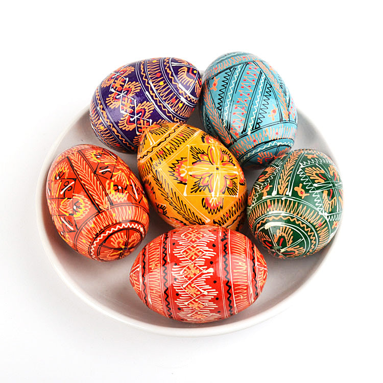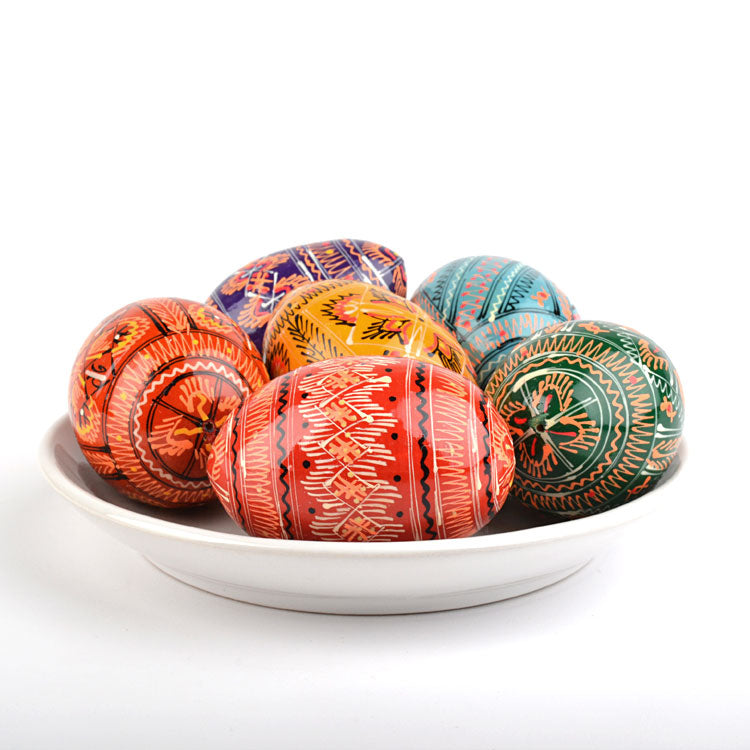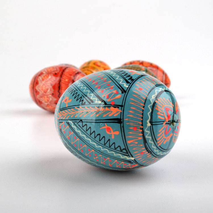 These fun wooden Pisanki eggs were hand-painted and gloss-finished by professional artists in Russia. They make a unique Easter gift with a handmade touch. Each egg is Approximately 2" to 2 1/2" long. Decorate in style by placing Pysanka with another type of egg, such as a single color dyed egg, or Krashenky.