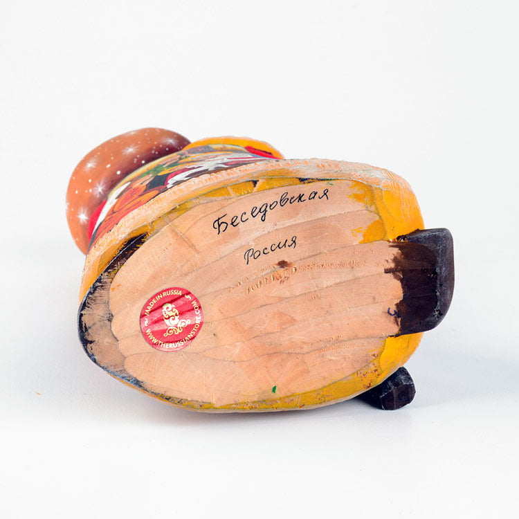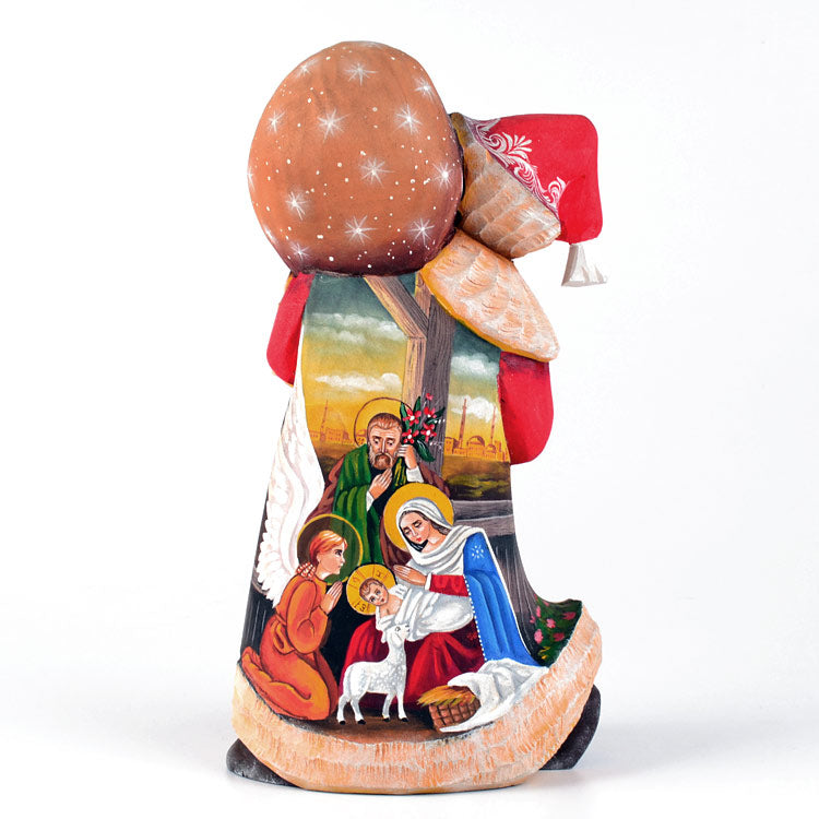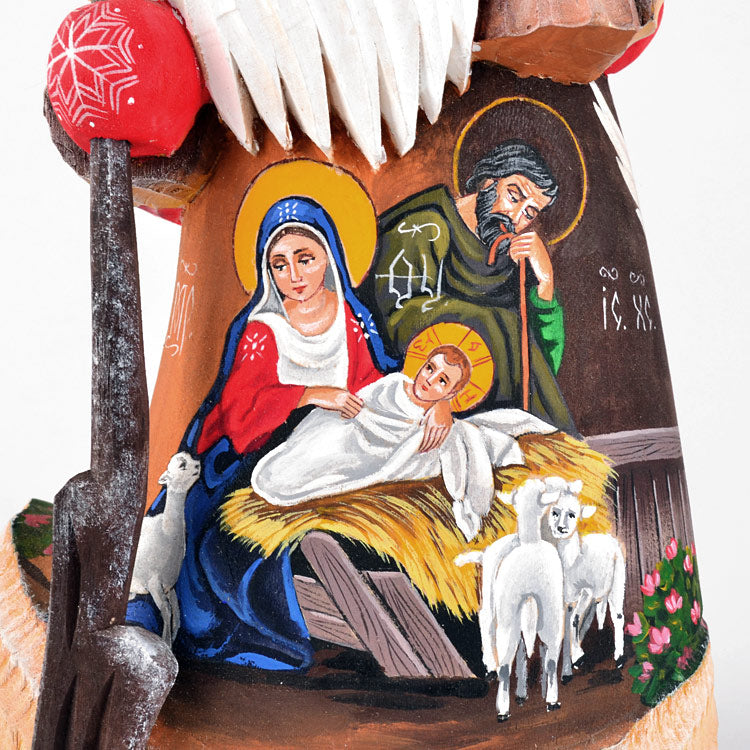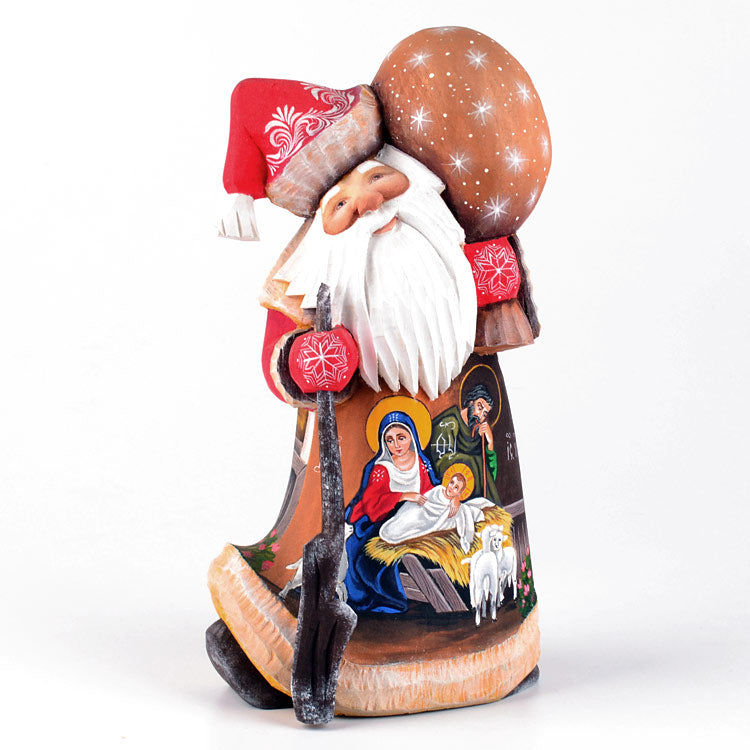This 9" tall friendly Santa decoration is a pleasure to have around the holidays, and makes for a unique Nativity Scene Christmas gift. Santa Clause has been expertly detailed and amazingly hand-crafted from a single piece of wood. His white beard, vibrant overcoat, and his kind eyes are sure delight everyone who meets him! The artist of this beautiful piece, signed the bottom.