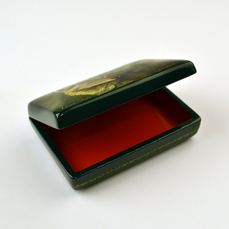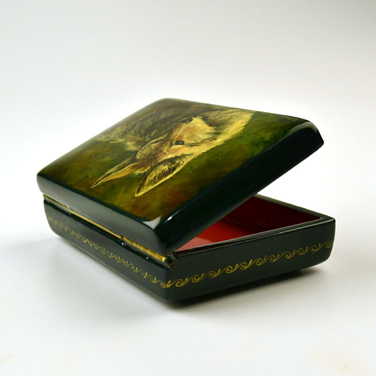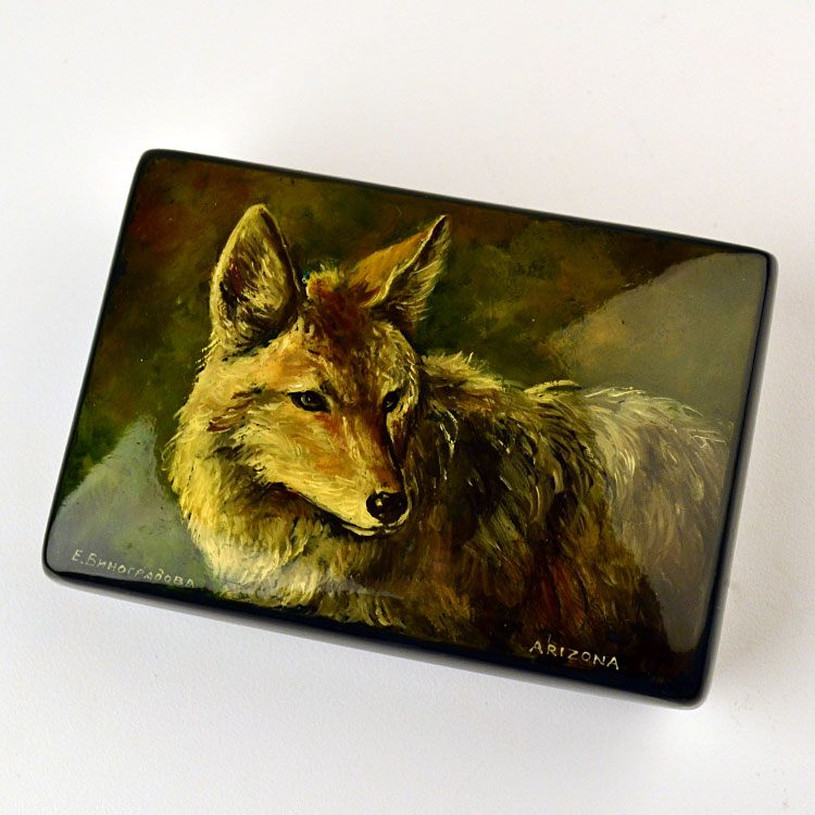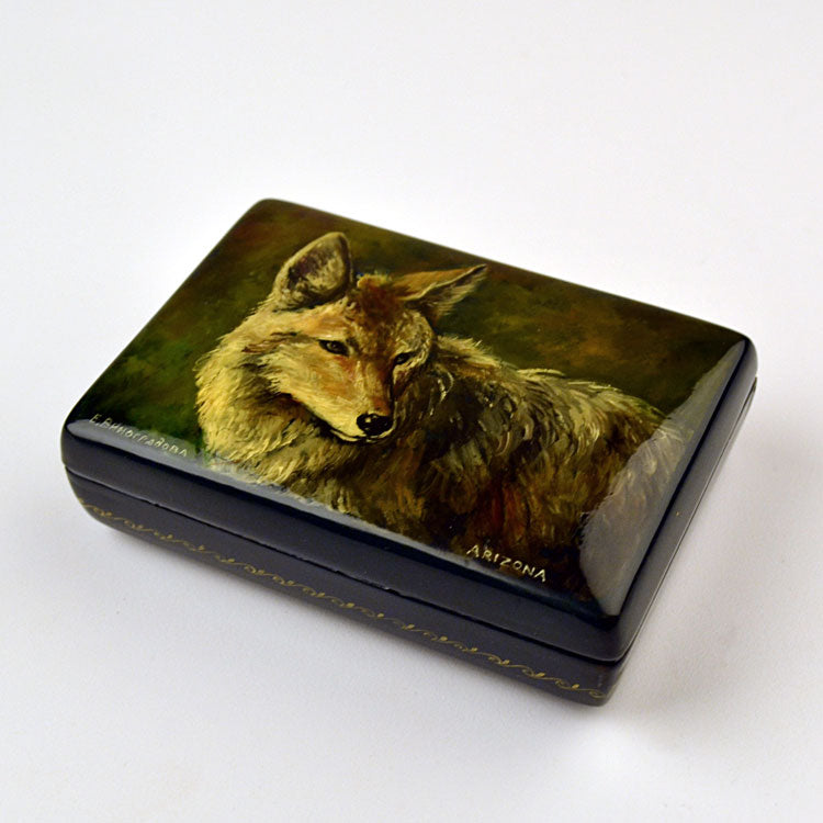 This beautifully painted coyote gift box was crafted in Russia with an Arizona theme, specifically for our store and customers. You will most likely never see authentic Russian lacquer boxes with an Arizona Southwest theme anywhere else but here at The Russian Store! The black colored, hinged box is about 4 1/4" x 3" in size, with a depth of about 1".