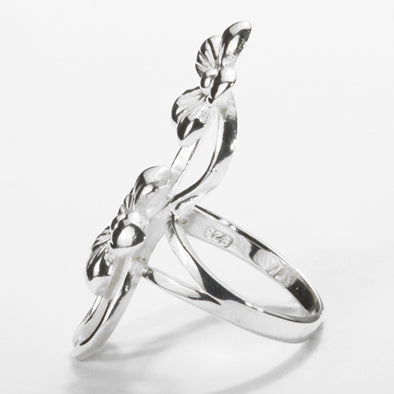 This designer inspired fashionable Hawaiian Flowers Ring is created in .925 Sterling Silver. Its very rare design is 1 3/8" long in a shape of three dimensional Hawaiian Plumeria flowers and makes this ring very attractive.