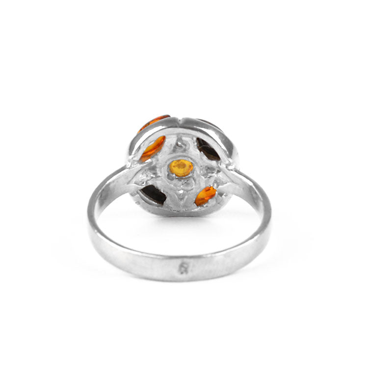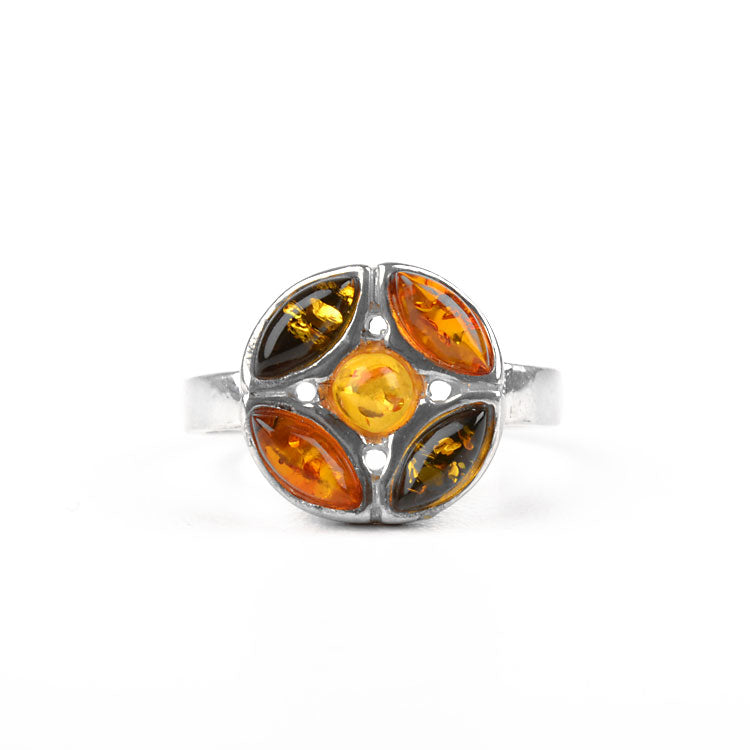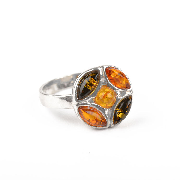 This small and comfortable to wear everyday ring consists of three different hues of genuine Russian amber, set in sterling silver. The green and honey amber stones are about 1/4" long and they surround a ball of citrine amber, 1/8" in diameter. The entire (fairly flat) face of this ring is 1/2" by 1/2" in size. Available in size 8.