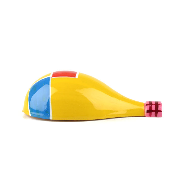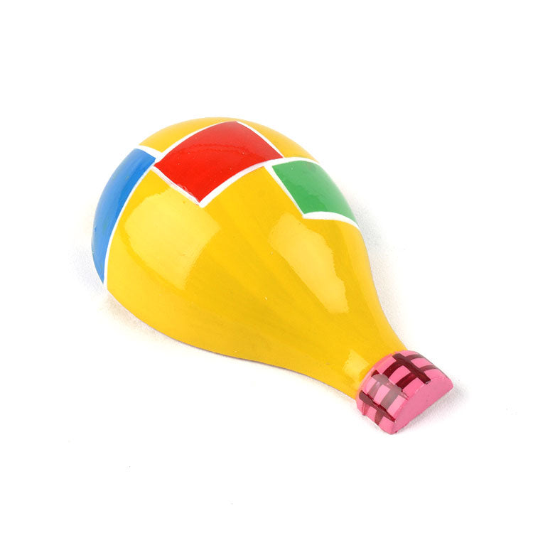 This colorful hot-air-balloon magnet was made in Russia from wood, hand-painted, and then gloss-finished just like the nesting dolls. It is about 3 1/2" long, 2" wide, and 1 1/8" thick. Contains one small magnet.