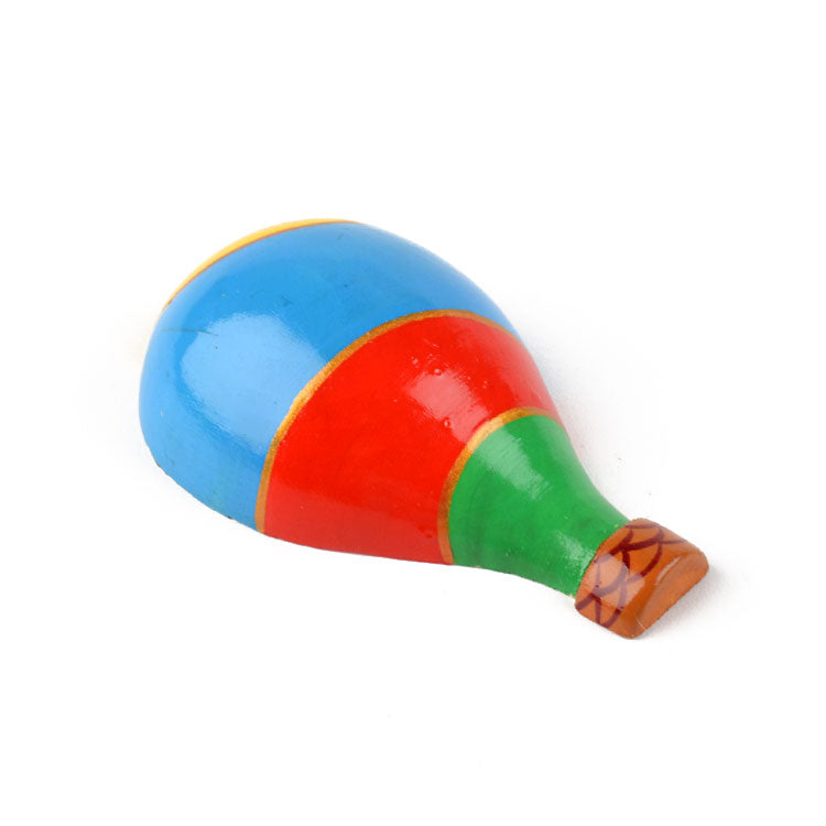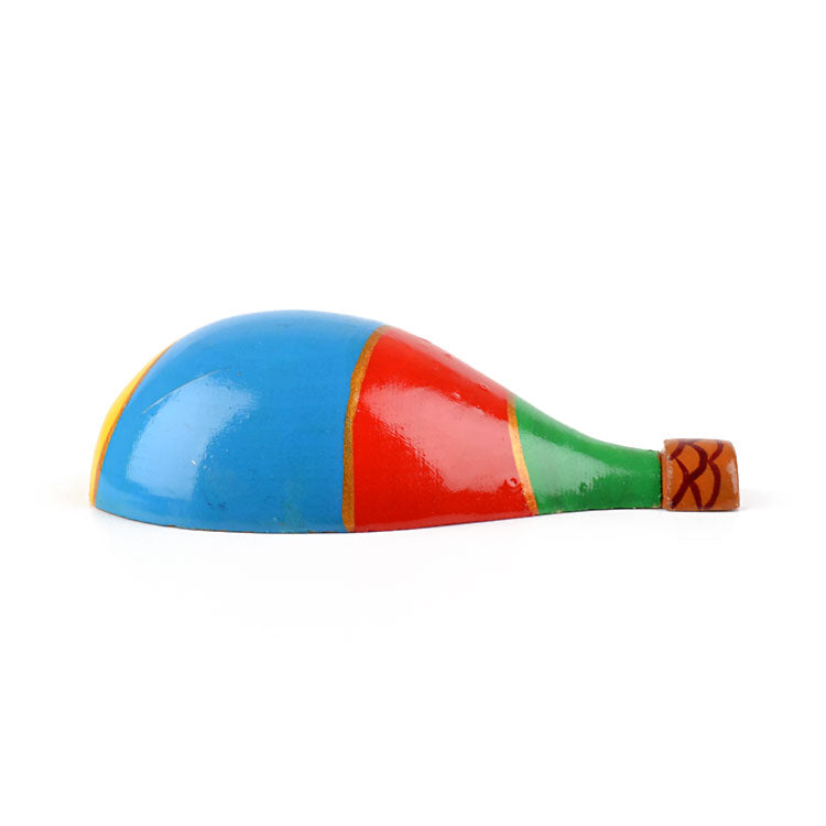 This fun, colorful hot-air-balloon magnet was made in Russia from wood. It was hand-painted, and then gloss-finished just like the nesting dolls. It is about 3 1/2" long, 2" wide, and 1 1/8" thick. Contains one small magnet.