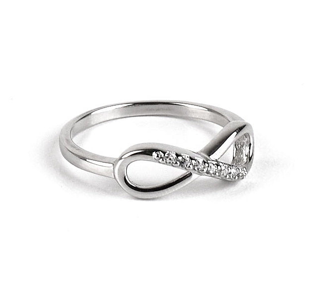Sterling .925 silver was used to form this simple yet fashionably designed infinity ring. The balance of the of symbol with seven small, sparkly cubic zirconia crystals and smooth silver create an elegant piece of jewelry.