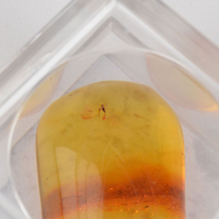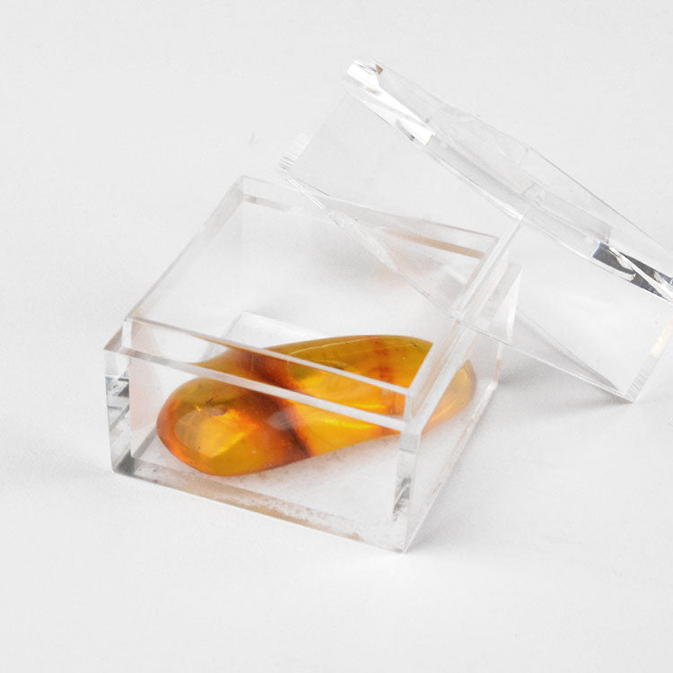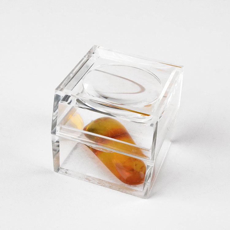 Collectible amber with insect (100% genuine) in a little storage box with magnifier glass. This 1 1/2" cubed box holds an amber nugget that contains an insect. The insect inclusion is made more visible with a built-in magnifier glass; the top part of the box. This unique display of collectible amber makes a great gift for anyone who loves history, as this was formed millions of years ago. The amber nugget is approximately 1 1/2" long, 3/4" wide, and 1/4" thick.