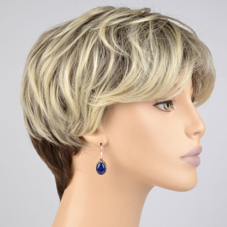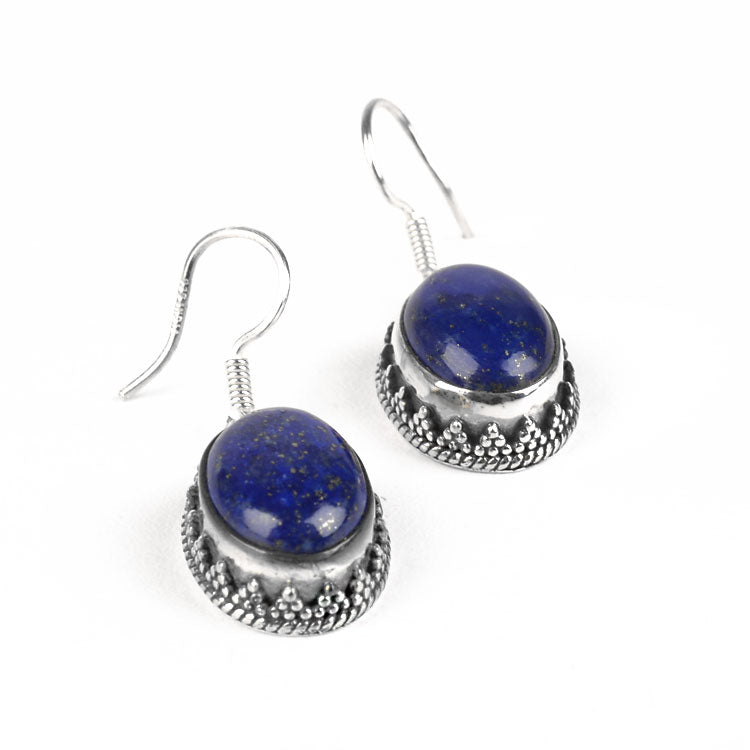 These deep blue color gemstone earrings feature slightly polished and natural lapis lazuli stones set in sterling .925 silver, which has been stylized around the base. The 1 3/8" earrings have simple hooks. Drops are about 3/4" long.