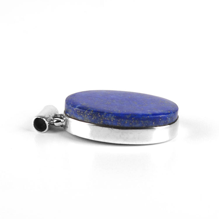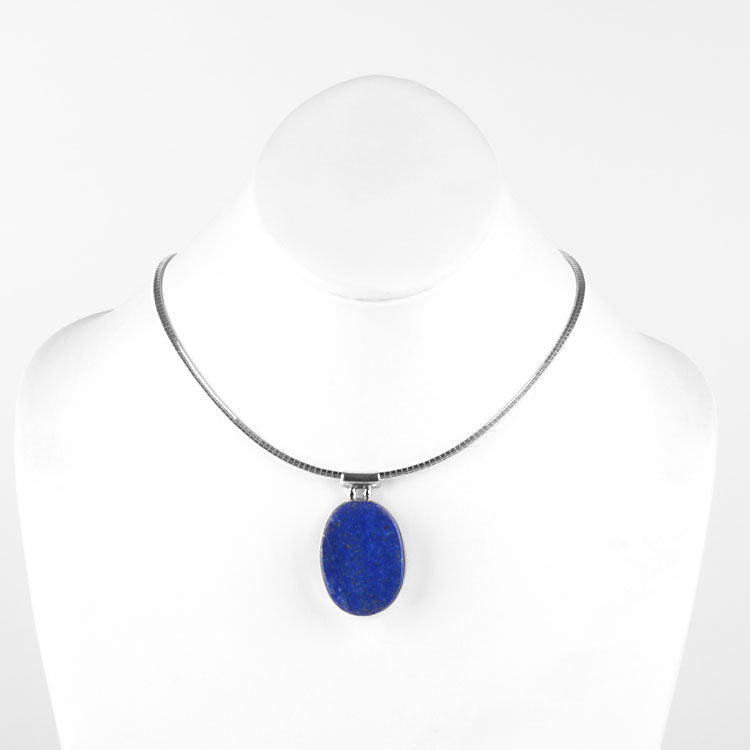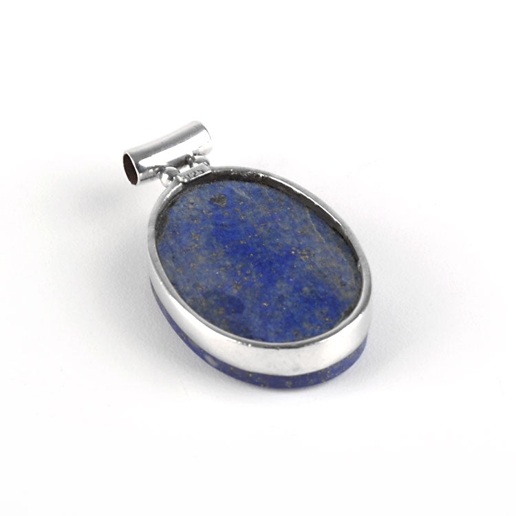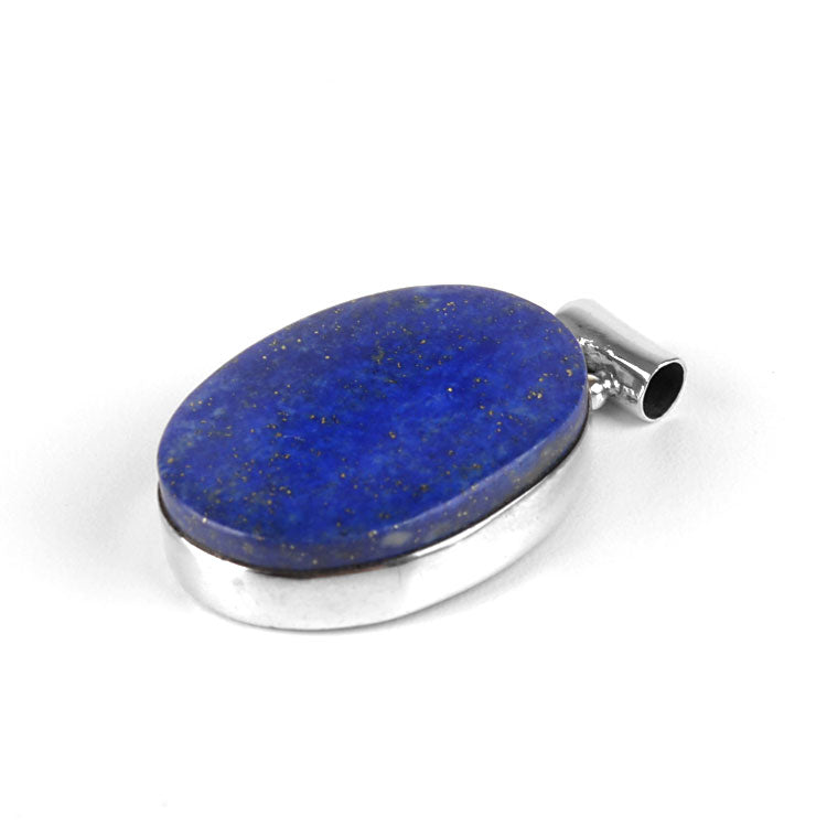 This fantastic blue gemstone pendant offers an interesting fashion look that goes great with many different outfits. The natural lapis lazuli gemstone is set in a framework of sterling .925 silver. This beautiful piece of gemstone jewelry was carefully hand-carved and polished to bring out its inherent beauty. Approximately 1 3/4" total length and about 1" wide. Chain not included.