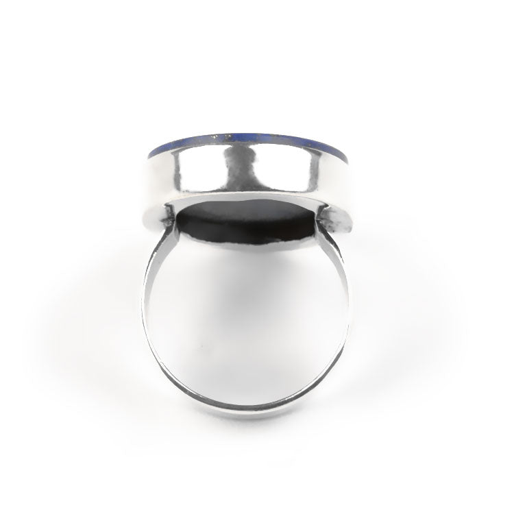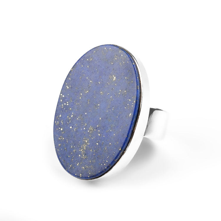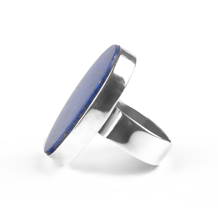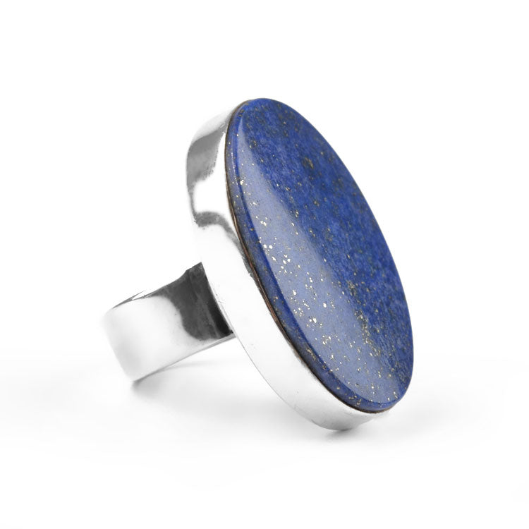 This bold blue gemstone ring is an excellent jewelry option for many, men or women. The large and natural lapis lazuli stone is approximately 1 1/4" x 7/8" in size and it is set in a very simple and wide sterling silver band. This is a wonderful ring for everyday wear and the shimmery blue gem looks great with your dark blue jeans!