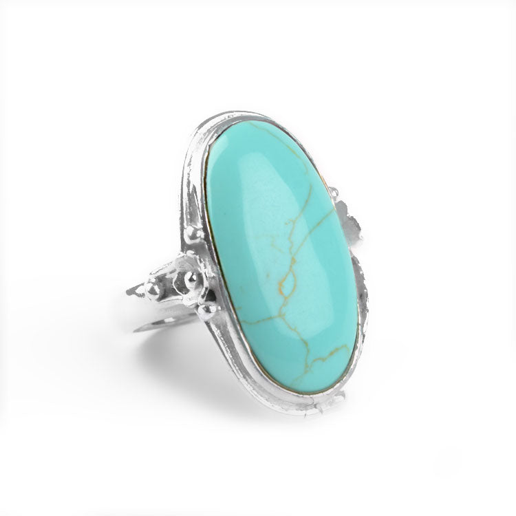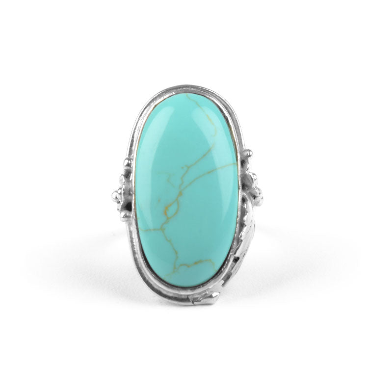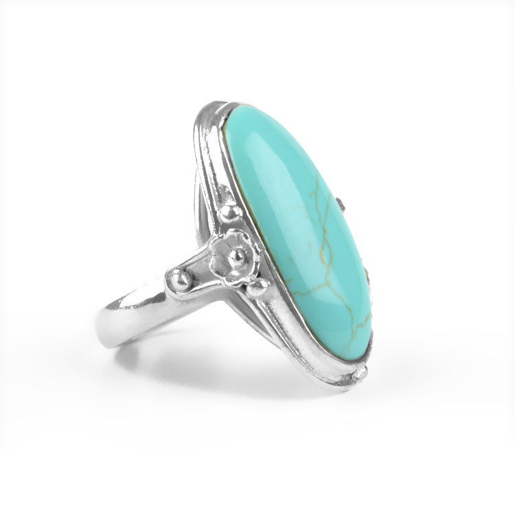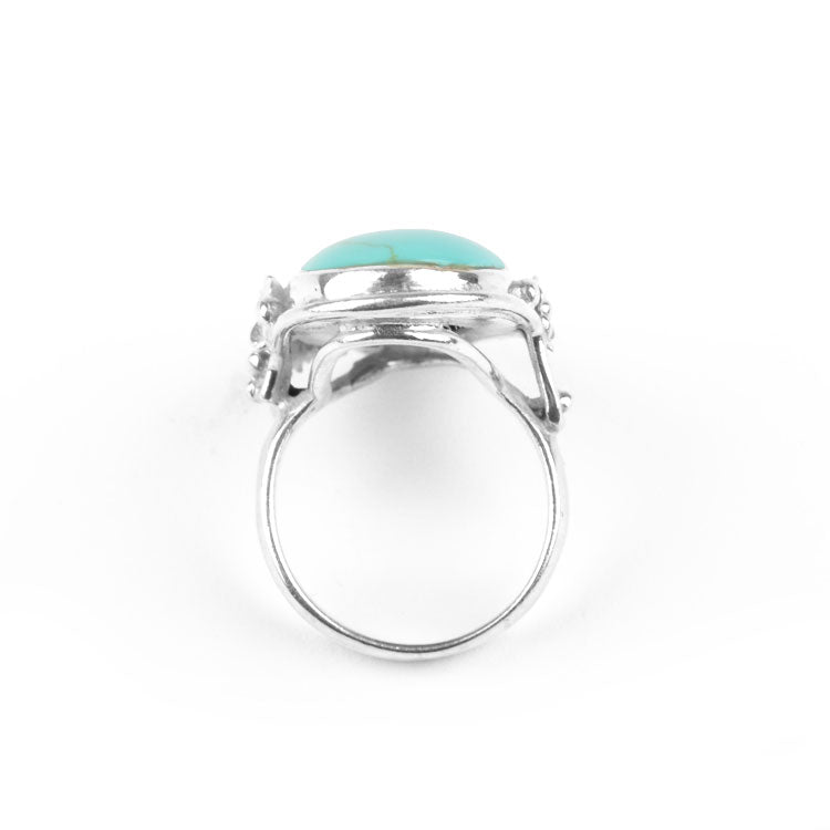 This large ring features a natural and polished turquoise stone that is 1 1/8" long and 5/8" wide. The blue-green gem is surrounded by a lovely detailed flower and leaves design made out of sterling .925 silver. This eye-catching ring is superb for anyone who loves big and bold jewelry, and/or anyone who loves turquoise! This ring is hand crafted, so the design might slightly vary.