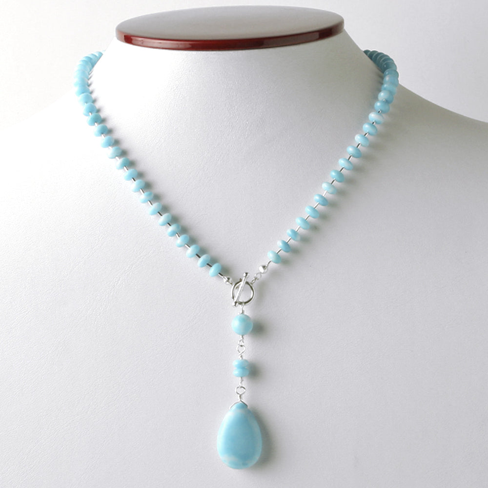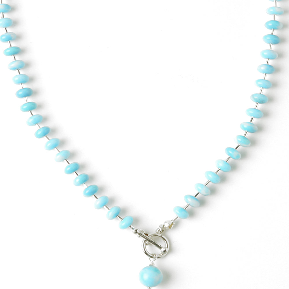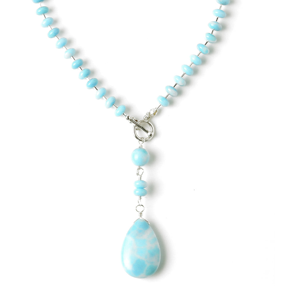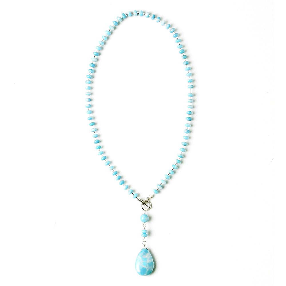 This modern light blue beaded Larimar necklace finishes with a beautiful Approximately 1" teardrop Larimar bead. It has .925 Sterling Silver spacers and a fun toggle clasp on the front. Each bead has a unique pattern of white matrix.