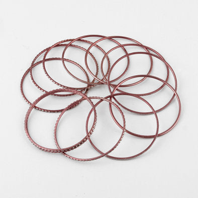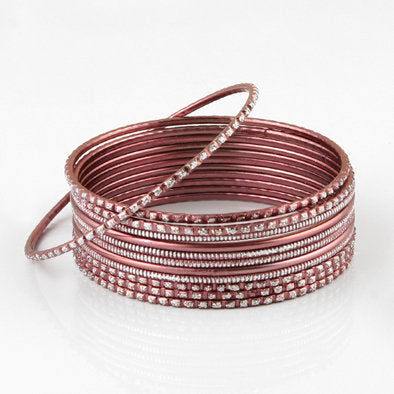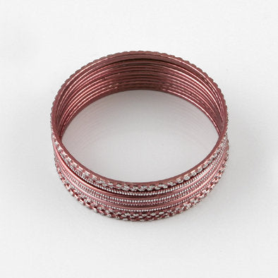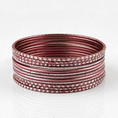 Wear this set of glittering light pink bangle bracelets Mixed with silver jewelry to add a bit of color to your ensemble. six bangles feature a checkered glitter design, four feature silver highlighted ribs, and two are solid pink. Comes with 12 bangles.
