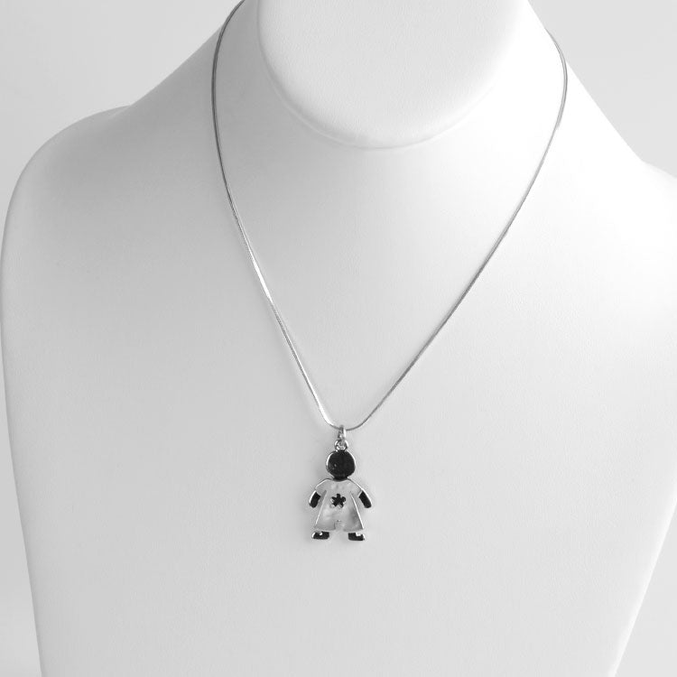 This cute lead free fashion pendant features highly polished silver toned metal and a frosted silver tone jumper with a flower cut out of the center. The little details make this pendant special. Looks great around the neck or as a key-chain! Grab one for the special little boy in your life, or perhaps for yourself to remind you of someone special.
