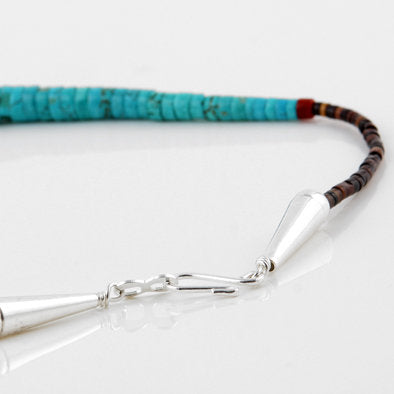 This one of a kind necklace features hand-crafted heishi beads and was hand-selected by us. The beads graduate from 1/8" in diameter tp 1/2". The necklace features all natural turquoise and measures 27" in length.