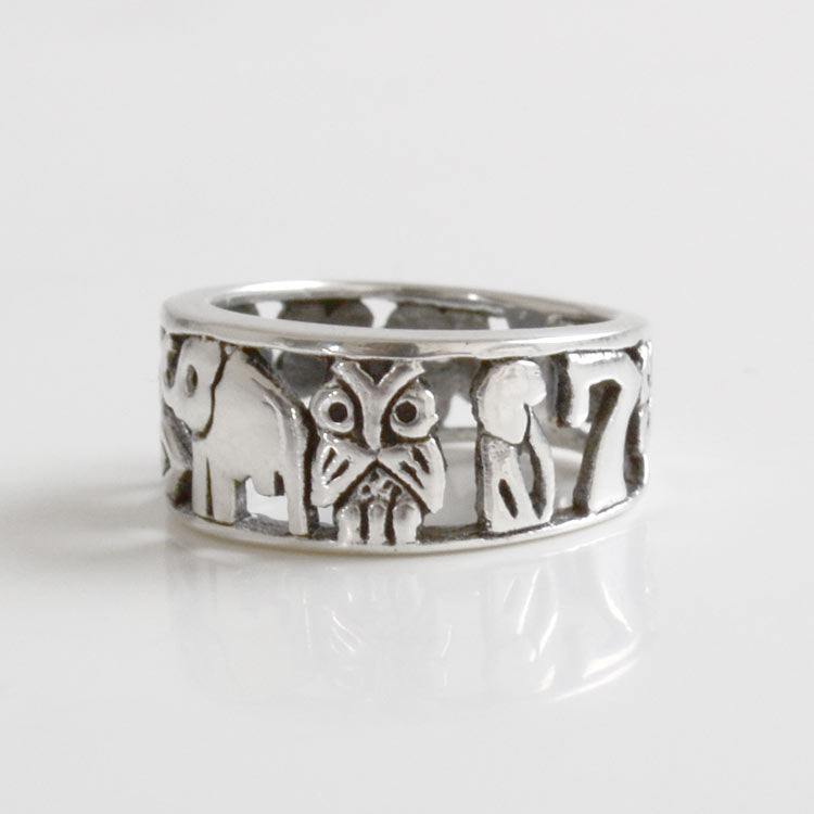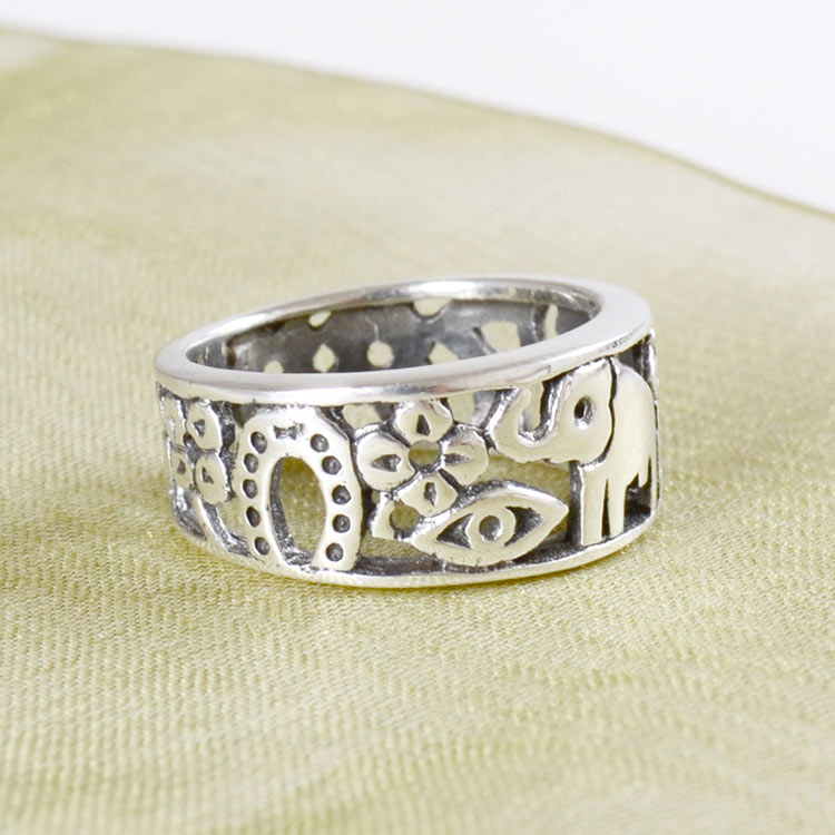 It is believed that an elephant with its trunk being raised up is a symbol of good luck and fortune. Joining this elephant is an owl, an eye, a horseshoe, 4 leaf clovers, and the number 7. This ring is made out of sterling .925 silver and is ready to bring luck to you!