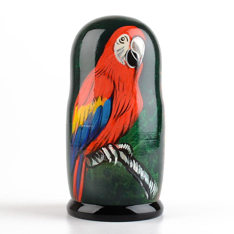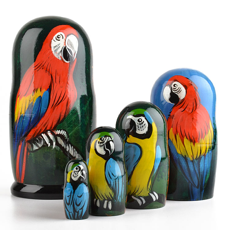 This bright parrot or Psittacines nesting doll was hand-crafted in Russia before being imported by us. This set includes five dolls, each with a different picture of a parrot. Approximately 6 3/4" tall. Makes a very unique gift for the parrot lover or owner!