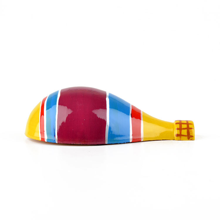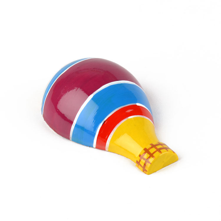 This fun magnet was crafted in Russia. The wooden hot-air-balloon was hand-painted and then gloss-finished, just like the nesting dolls. About 3 1/2" long, 2" wide, and 1 1/8" thick. Contains one small magnet.