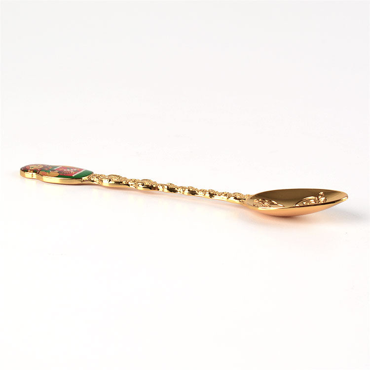 This cute, gold color spoon features a brightly colored enameled matryoshka at the top, with 6 more metal matryoshki below it. It is nearly 5 1/2" long and 1" wide. Looks great in a Russian tea glass and features wonderful detail.