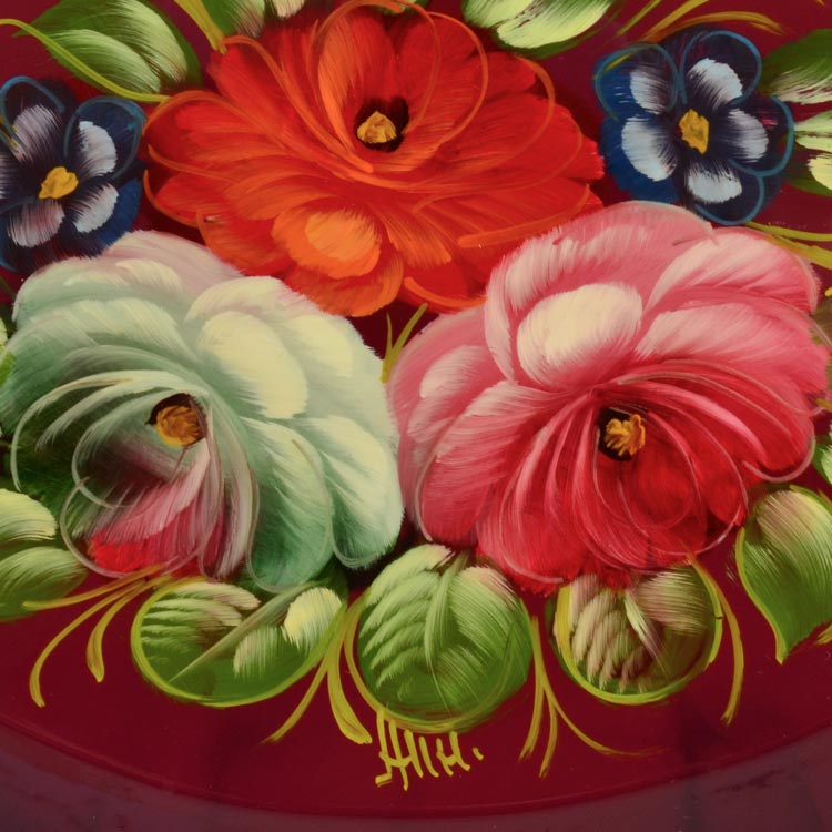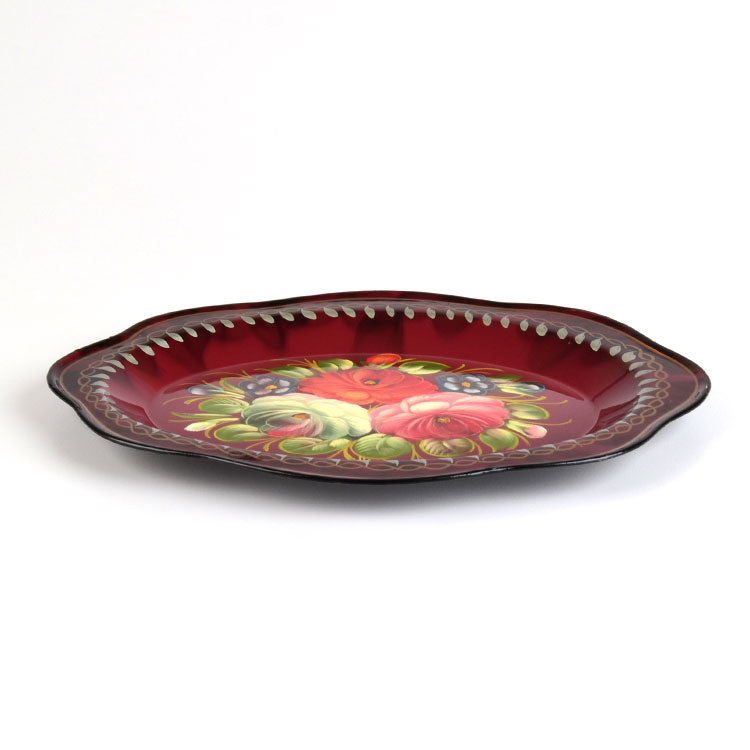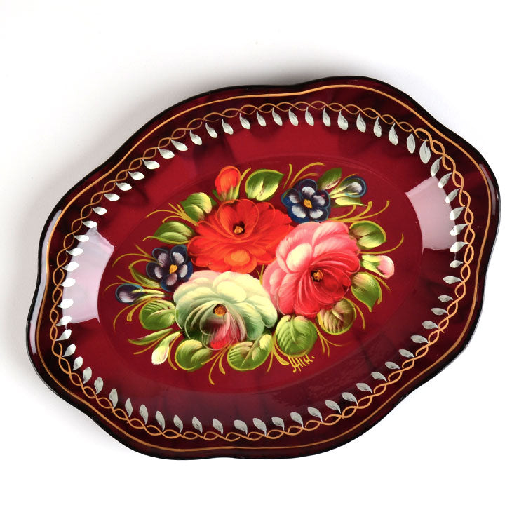 Serve food in style or decorate your kitchen with beautifully hand painted Zhostovo trays from Russia! These trays are made just like they were centuries ago, and they last forever. This particular, fairly small tray features an orange, a white, and a pink colored flower decorating a deep red background. It is approximately 9" x 6 3/4" in size. It also has a nice gold and silver border along a scalloped edge. A signature by the artist on the front, a lacquer finish, and a finial polish, completes this pretty little plate. Pick one out today!