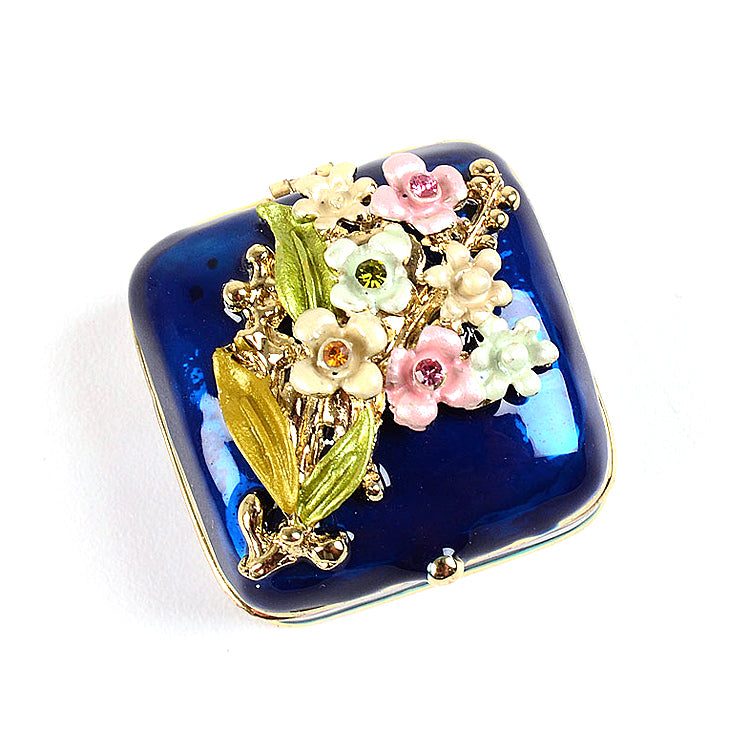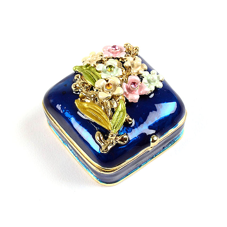 This mini box, although tiny, is still ideal for holding a small chain or other tiny nick-knack. It is made from strong pewter, hand enameled with thick paint, gold plated with 24 karat gold, and decorated with sparkling crystals on the bouquet. Contains a hinge and one magnet.