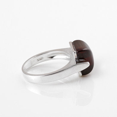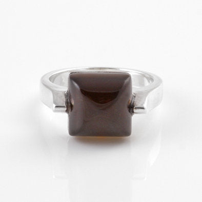 This modern ring features a rich cherry amber square held between two prongs of .925 sterling silver. Elegant design.