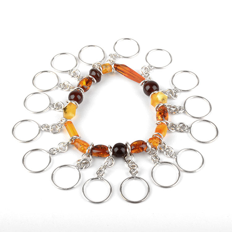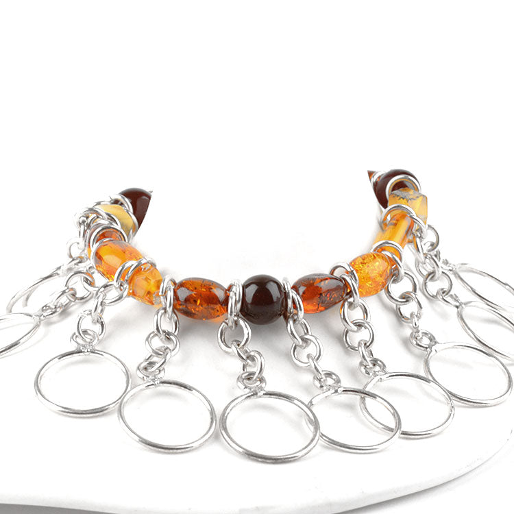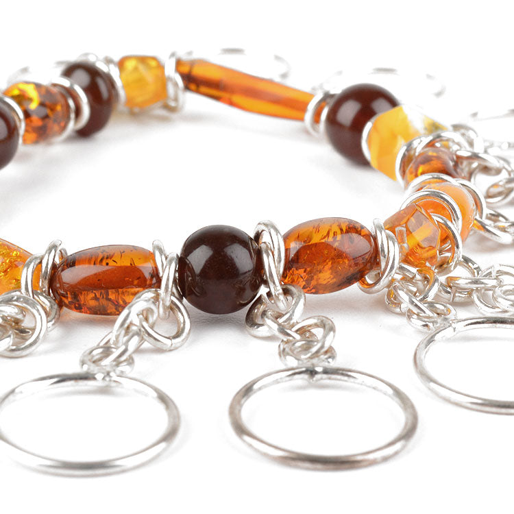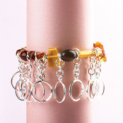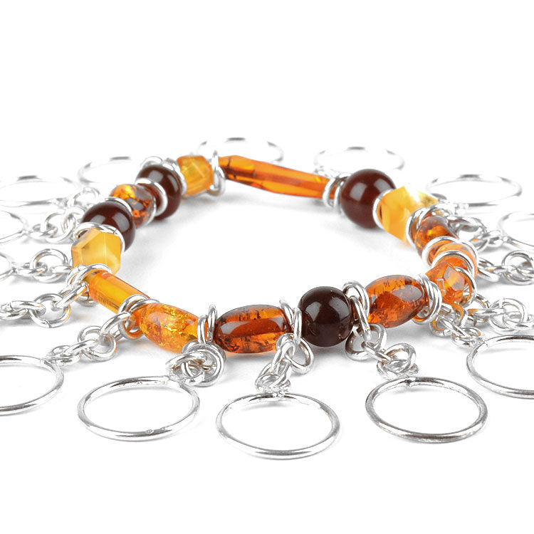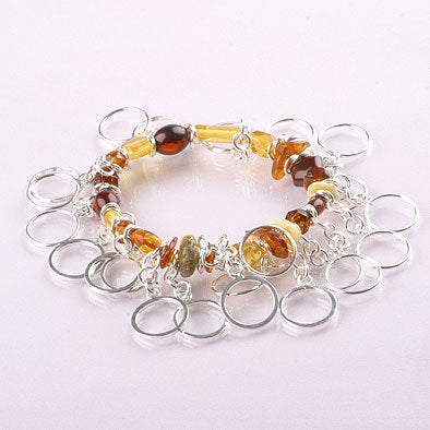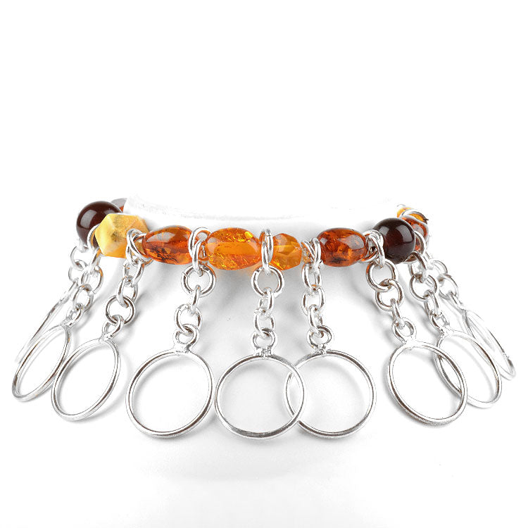 This genuine amber and sterling silver bracelet is both fun and stylish. The Baltic Sea stones are colorful and unique; each amber bead has its own beauty. Different cuts (rounded, faceted, oval) of butterscotch, honey, cognac, and citrine amber can be seen on this wonderfully made stretchy bracelet. The design of the bracelet allows the silver ring charms flow and dangle effortlessly and beautifully. This is a truly unique piece of jewelry that looks great as-is, or with more charms added. Great for wrists Approximately 5 1/2" to 6 1/2" in size.