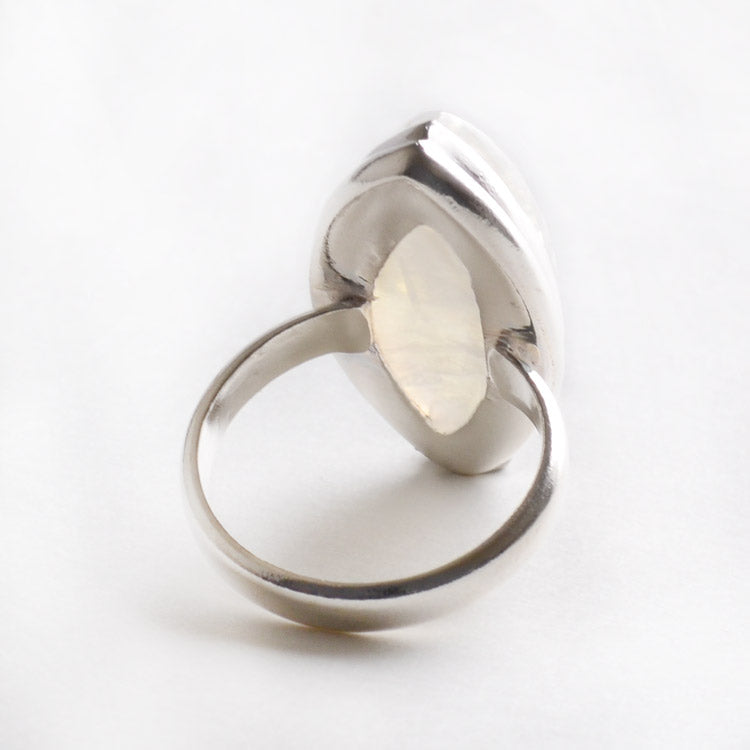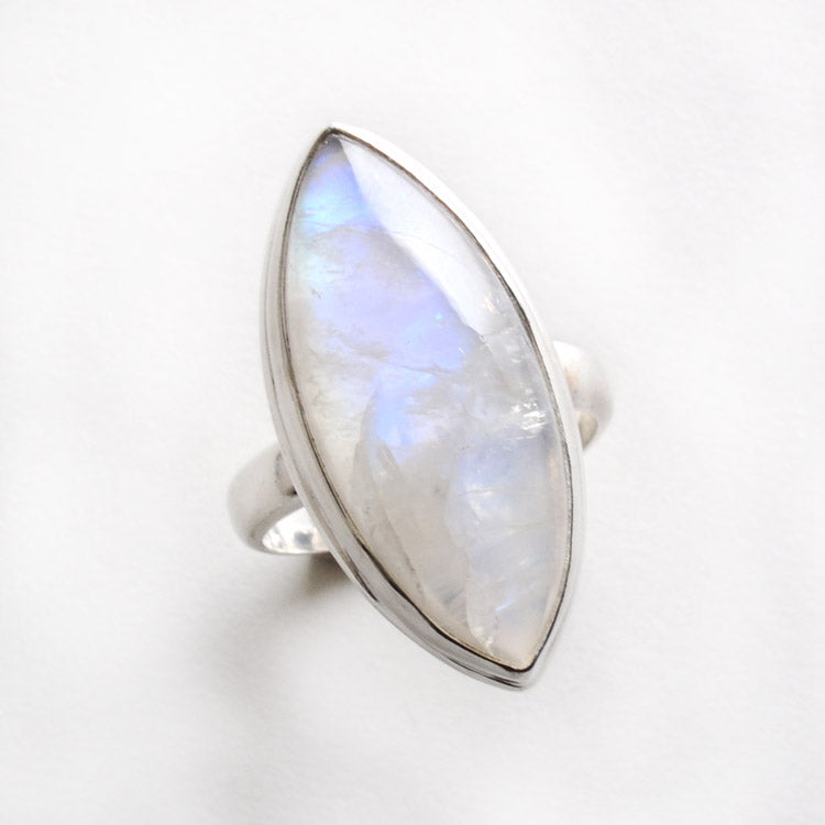 This semi-large ring features the mysterious moonstone that has been shaped into a pointed oval. It sits in sterling .925 silver which has been left simple and smooth. This ring is an iridescent delight, a must have to anyone's jewelry collection.