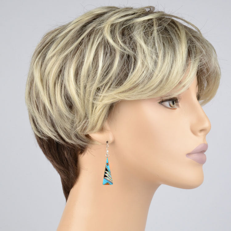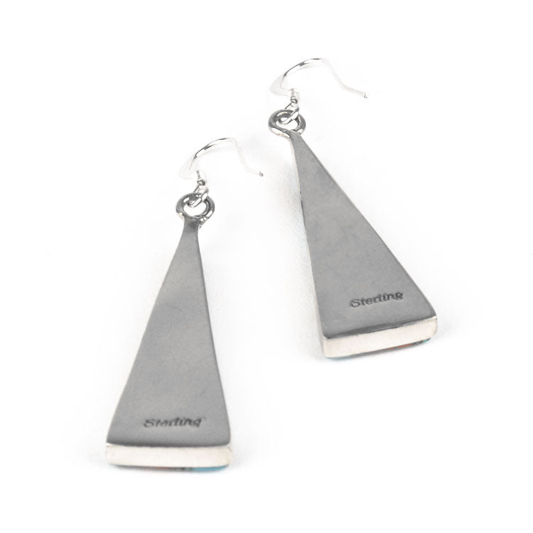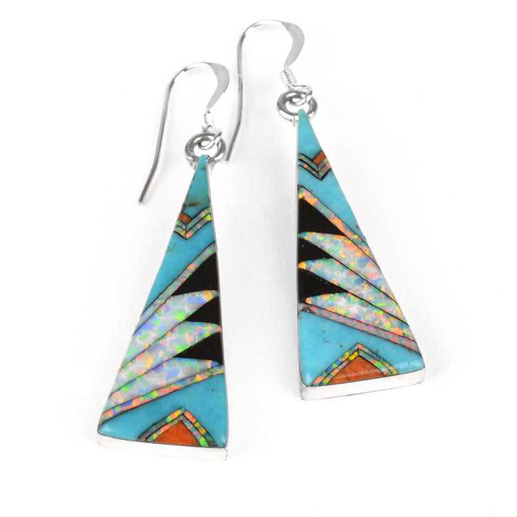 These triangle shaped earrings feature an inlaid mosaic of gemstones in an angular fashion. The Southwest Zuni mosaic earrings have opal, turquoise, spiny oyster shell, and onyx. Made with sterling silver and simple hooks. About 1 7/8" total length with a drop of about 1 1/4" long.