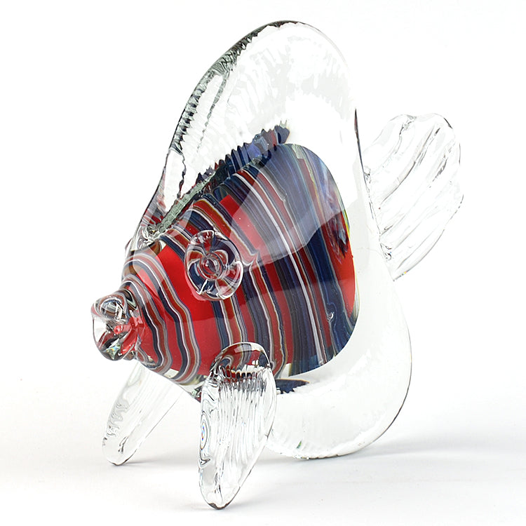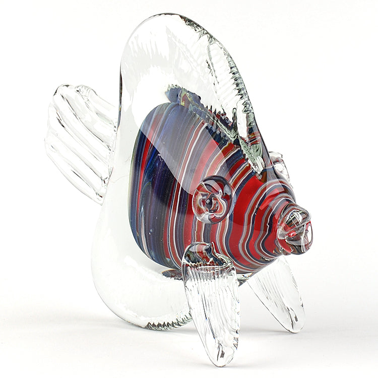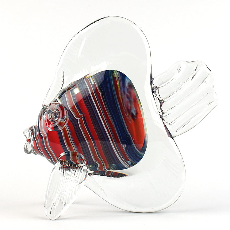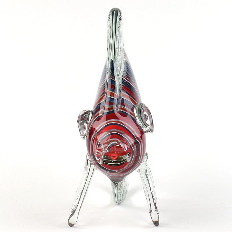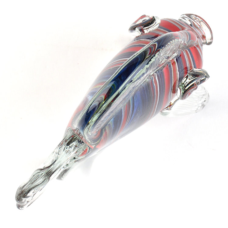 The multi-colored pattern of the glass fish figurine is arranged to flow elegantly with the body of the fish. This unique glass fish figure features a red, blue and white color scheme with clear color of fins and tail. It is a solid body that features detailed work that makes it one-of-a-kind. Can be displayed on a coffee table, desk, shelf, mantle or dresser. This fish measures about 7 1/2" long and 7 1/2" tall. Due to the mouth-blown nature of art glass air bubbles and small imperfections will be present and are not considered a defect. No two pieces are exactly alike.