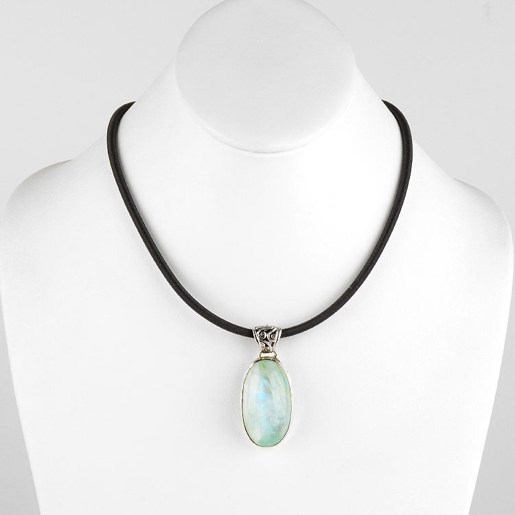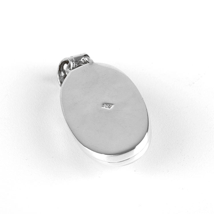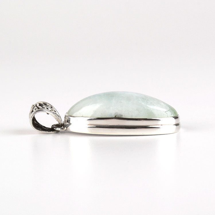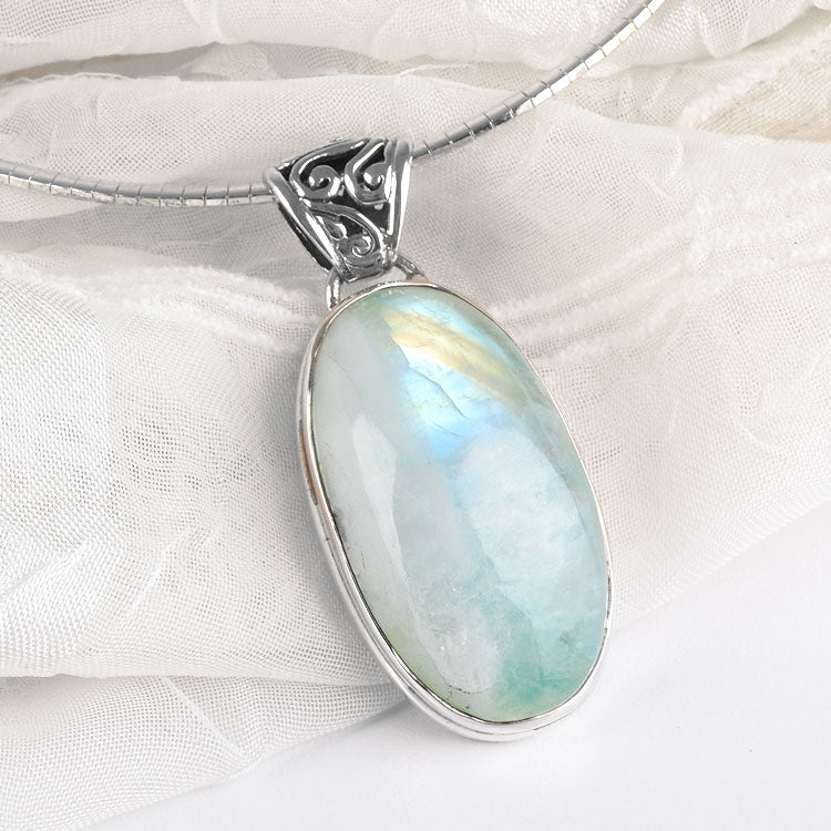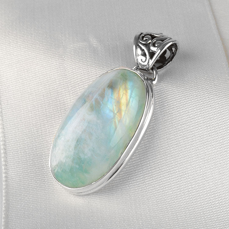 This unique pendant features one beautifully natural moonstone gemstone that has been polished and set in sterling .925 silver. The bail is a filigree of silver design adding to the glamour of this piece of jewelry. This pendant's total length is just over 1 3/4" long, total width is just over 3/4" wide, and it is nearly 1/2" thick. As with all moonstones, this one glows when viewed different ways.